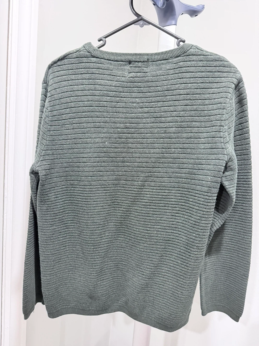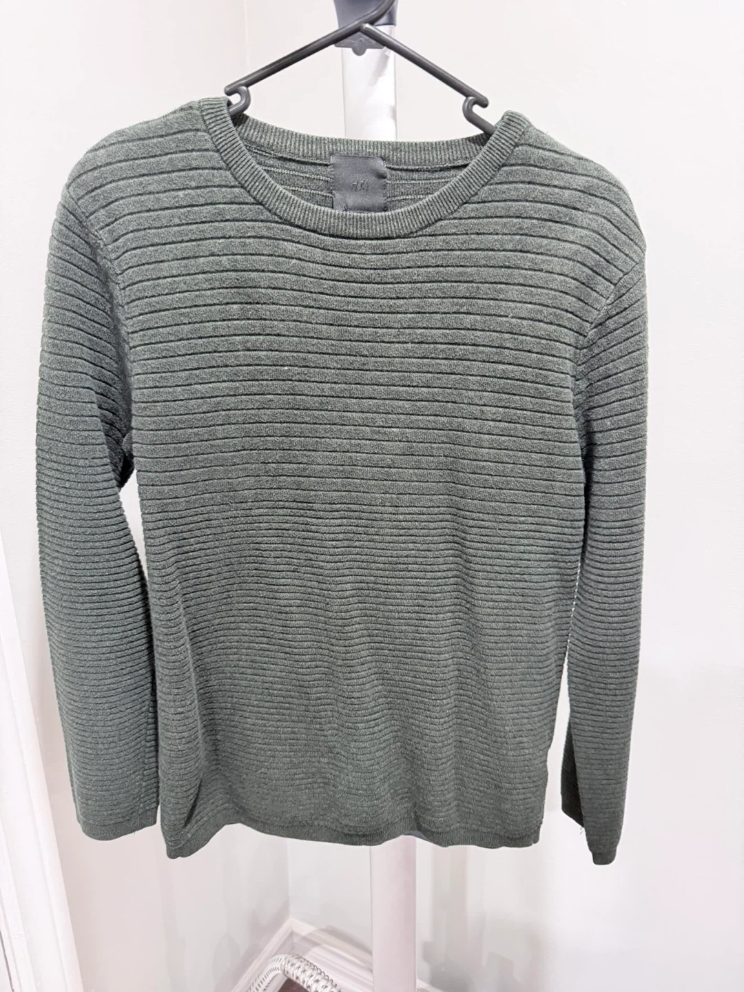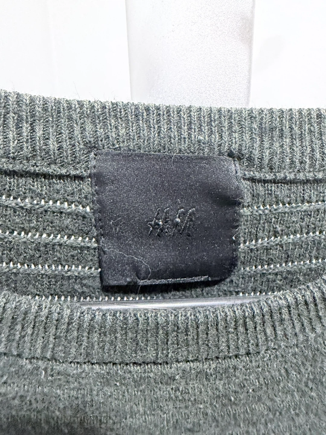 This H&M crewneck sweater is made of 100% cotton and features a subtle striped texture. It's a size small and comes in a dark green colour. This sweater is a great layering piece for everyday wear.