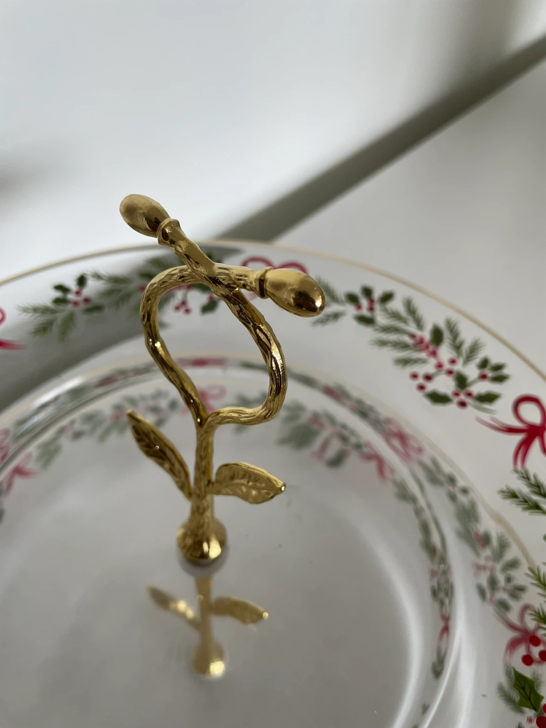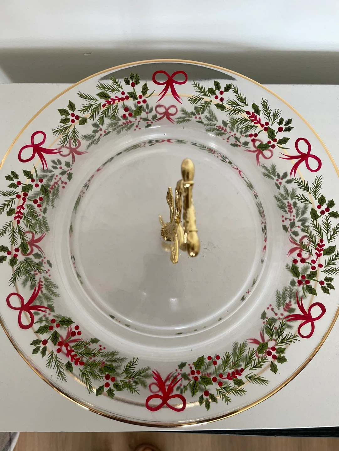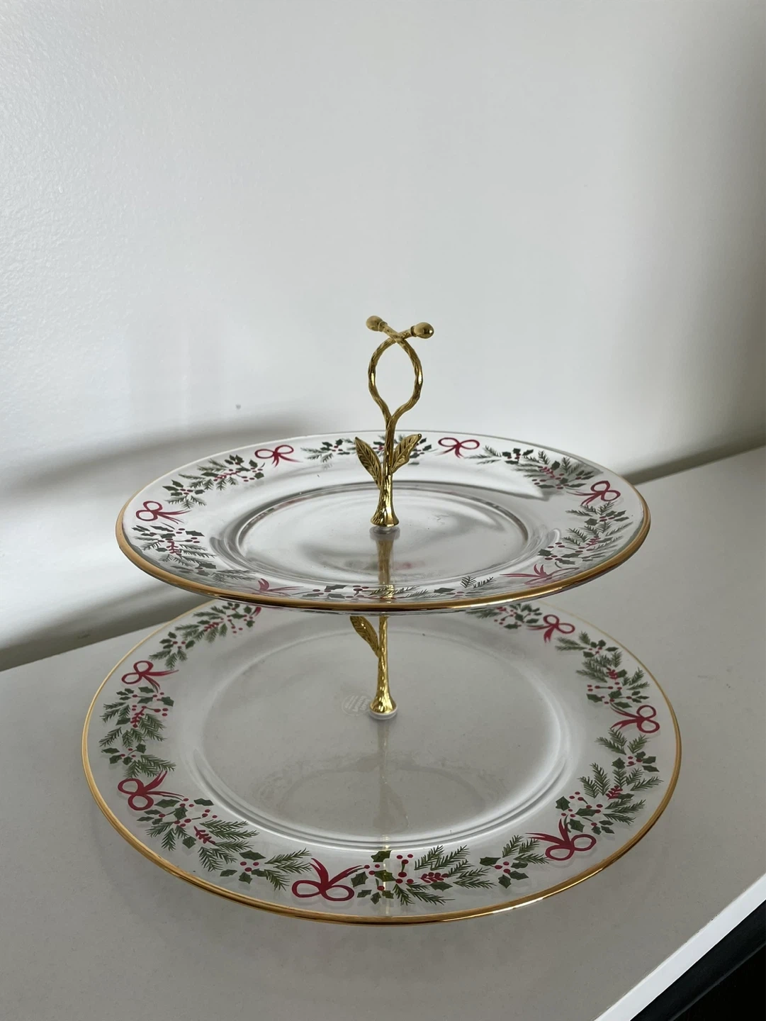 Clear glass two-tier serving tray with a festive and berry design, accented with red bows and gold trim. Features a decorative gold-toned handle. Perfect for serving!