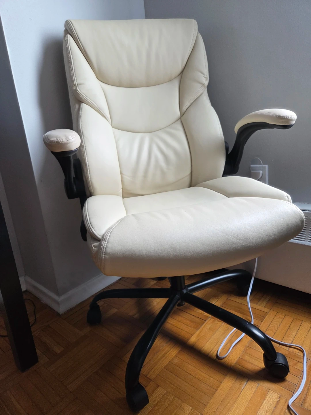 This is a cream-coloured office chair. It has a padded seat and backrest. The chair features armrests and a five-star base with casters for mobility.
