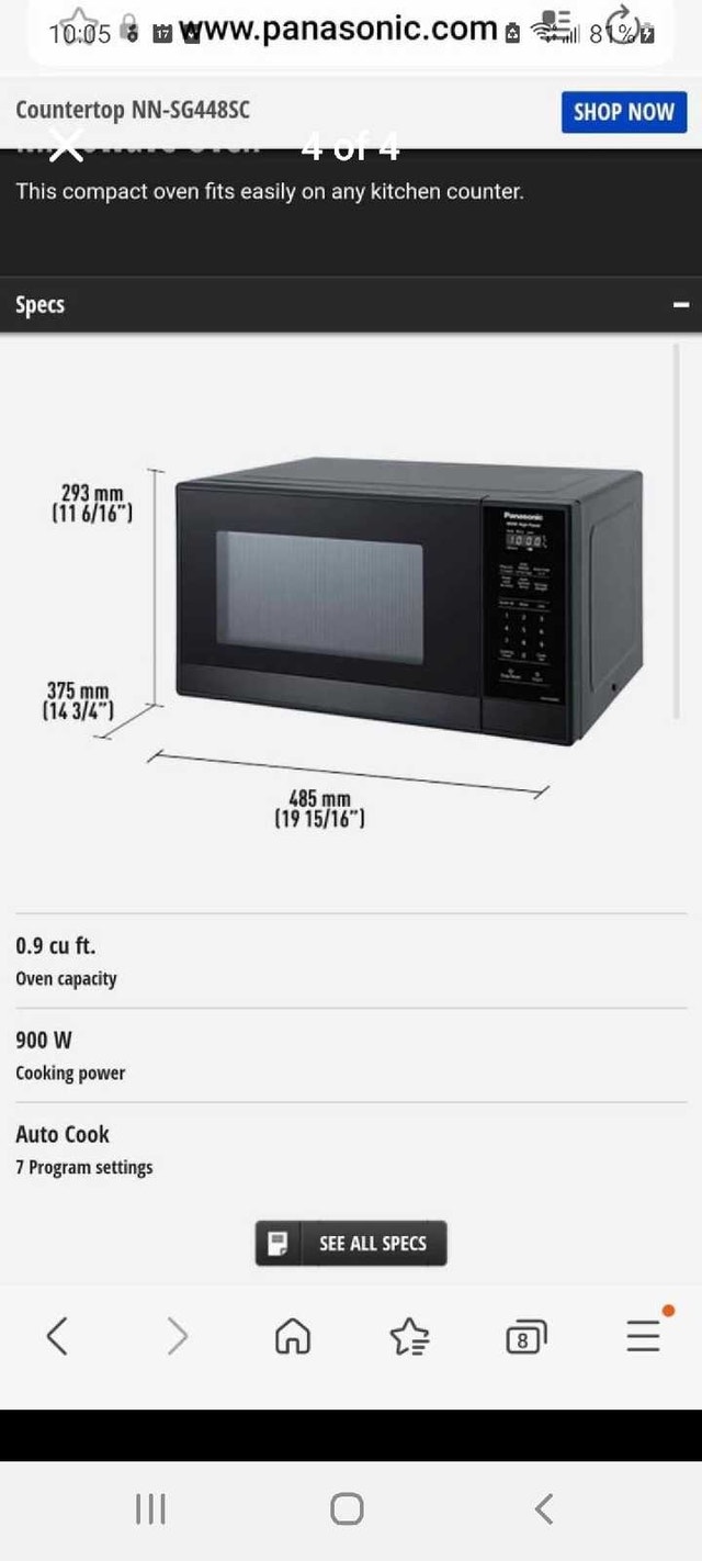Used Panasonic microwave in good working condition, perfect for any kitchen! It’s a compact 0.9 cu. ft. size with 900W of cooking power. The dimensions are approximately 19 15/16" x 14 3/4" x 11 9/16".