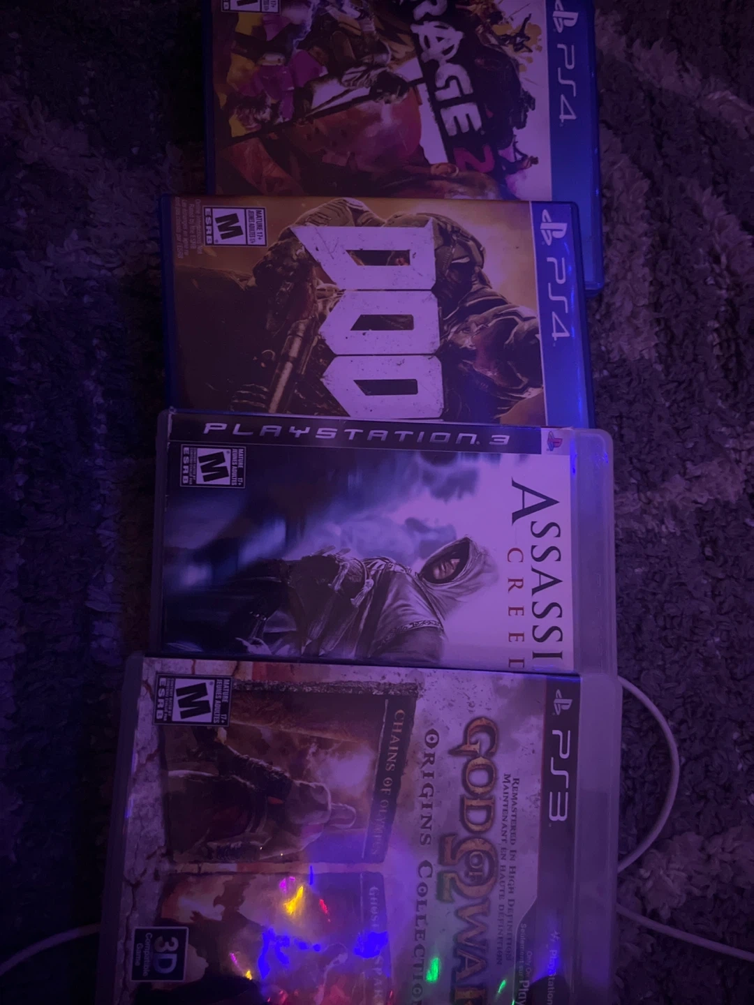 Bundle of four video games for PlayStation 3 and PlayStation 4. Includes God of War Origins Collection, Assassin's Creed, Doom, and Rage 2. All games are rated M for Mature. 25 and it’s yours no questions asked