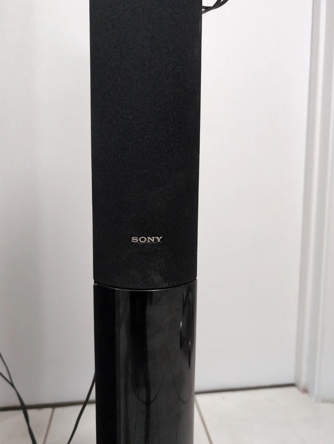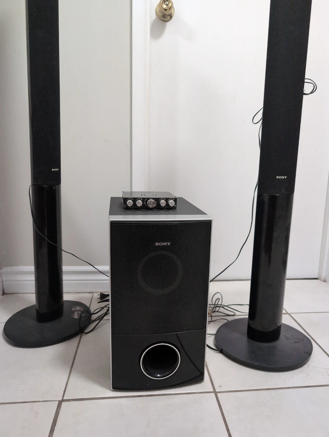 This is a Sony speaker system. It includes a subwoofer and two tower speakers. The system is black.it also includes an amplifier.