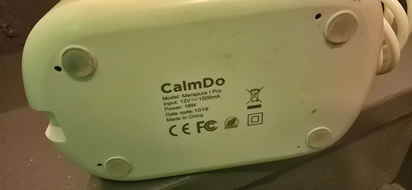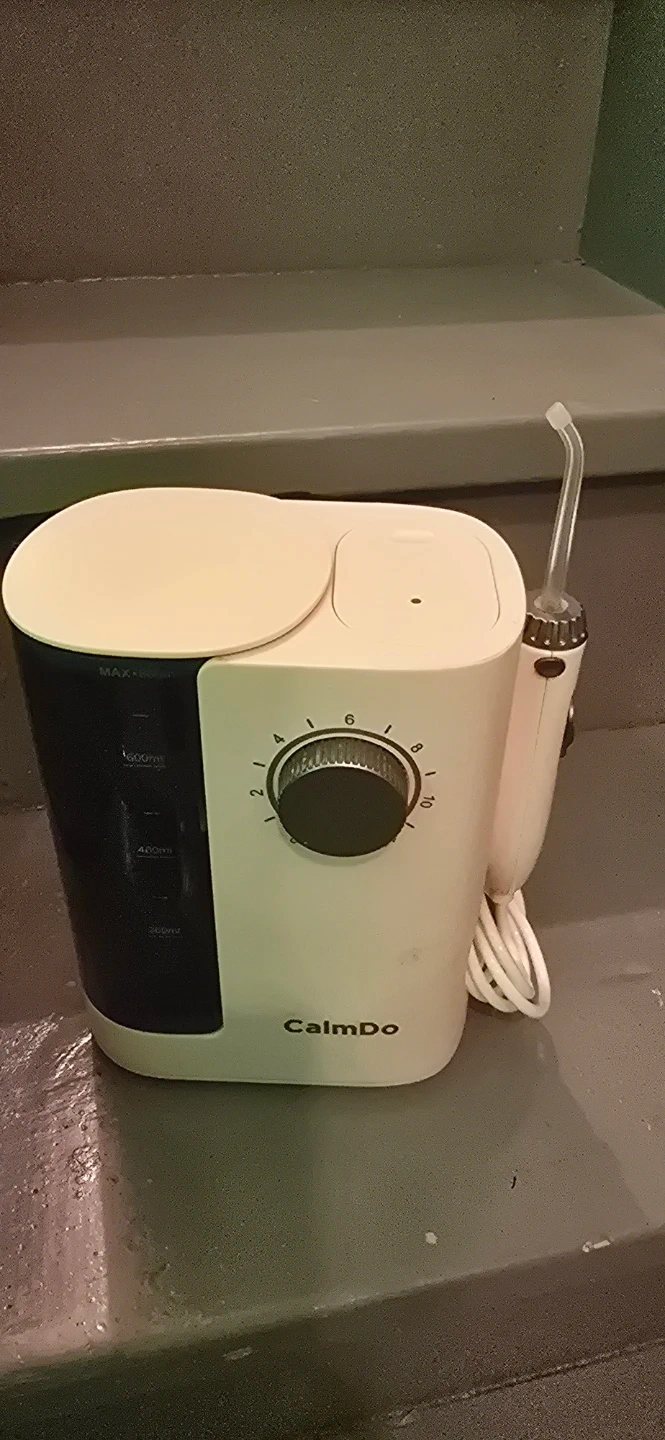 CalmDo Merapure I Pro water flosser with multiple pressure settings. It features a 1000ml max capacity water tank. This unit requires 12V / 1500mA input and uses 18W of power.