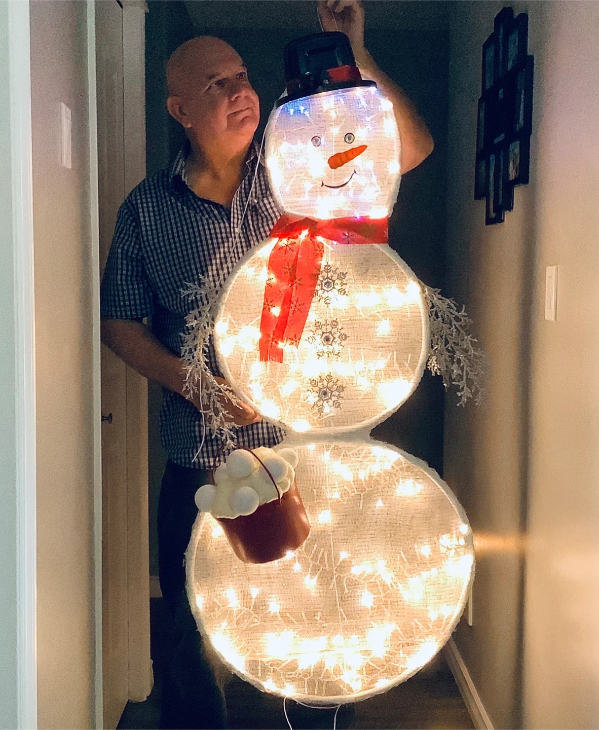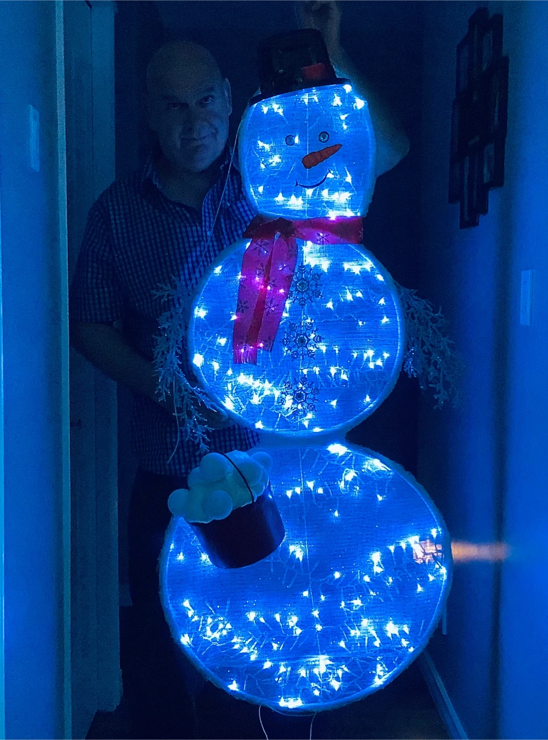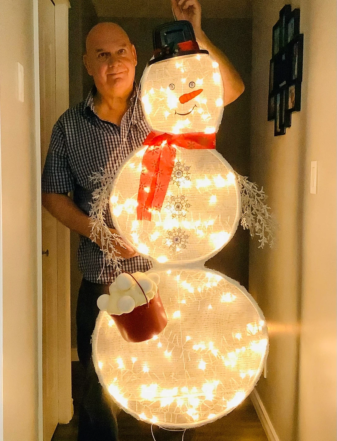 A fun lighted snowman decoration for the holidays! It's in great shape and ready to add some festive cheer to your home. Impressive display for your home entry, party venue, Christmas Party