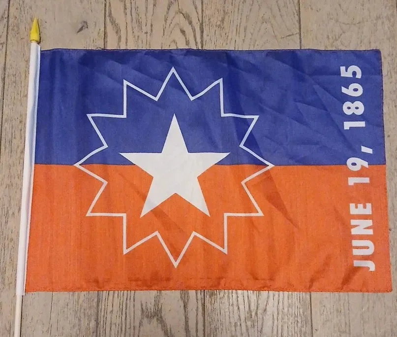 This flag commemorates Juneteenth, featuring a blue and orange bicolor design with a white star and starburst. The date "June 19, 1865" is printed vertically along the right edge. It's mounted on a white plastic pole with a yellow tip. This flag represents a significant historical date.