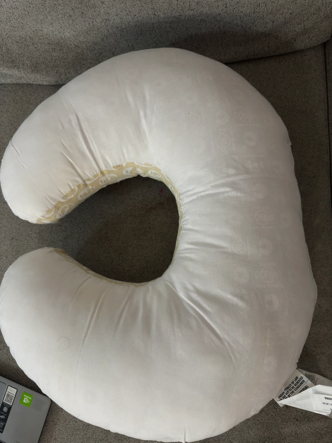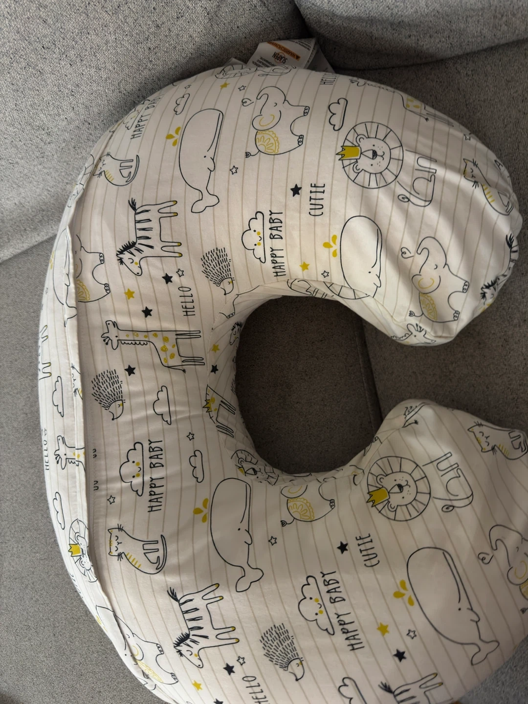 This is a Boppy nursing pillow. It's white with a cute animal print. It has 2 covers which are removable and machine washable. It's designed to provide support during feeding and tummy time.