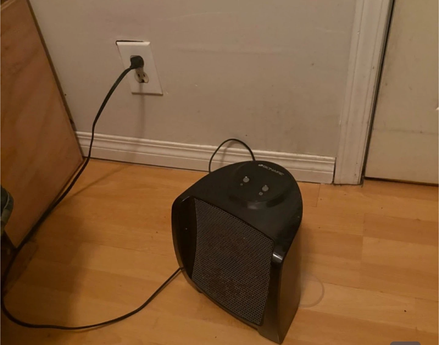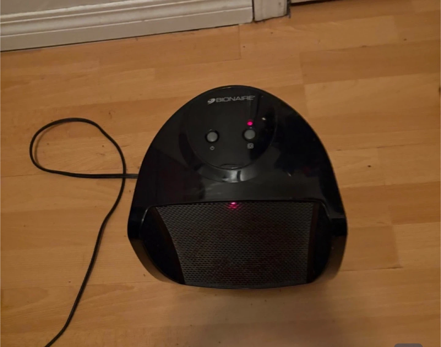 This is a Bionaire portable electric heater. It's black and comes with a power cord. It has two buttons on top for control. This heater is good for warming up small spaces quickly!