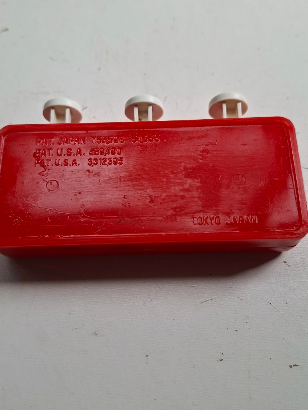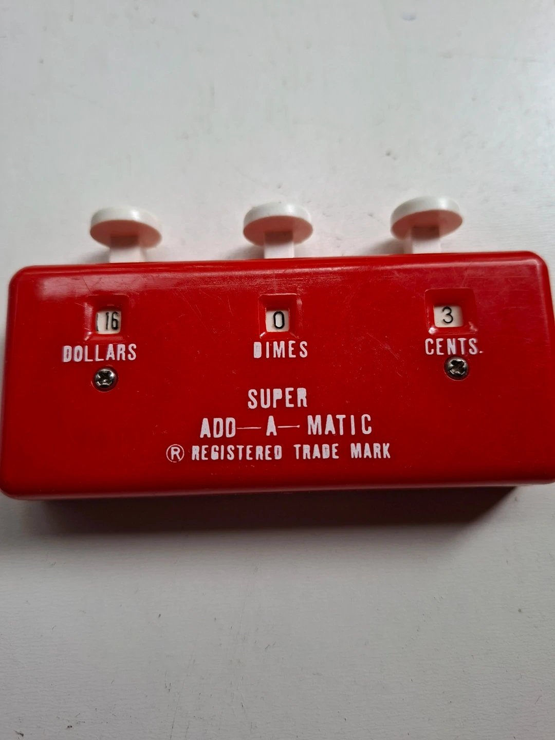 This Super Add-A-Matic mechanical coin counter helps track dollars, dimes, and cents. It's made of red plastic and manufactured in Tokyo, Japan. This counter would be useful for anyone wanting to keep a quick tally of their loose change!