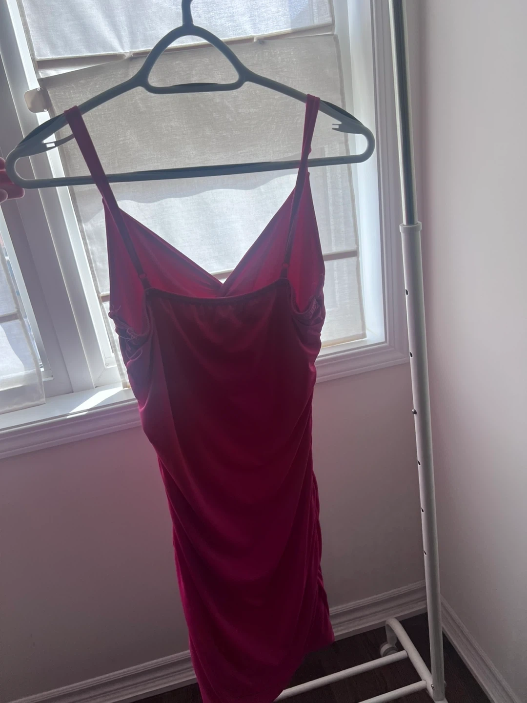 Streetwear Society pink ruched dress. It's a size XL with spaghetti straps and a V-neckline. This dress is suitable for a night out or a special occasion!