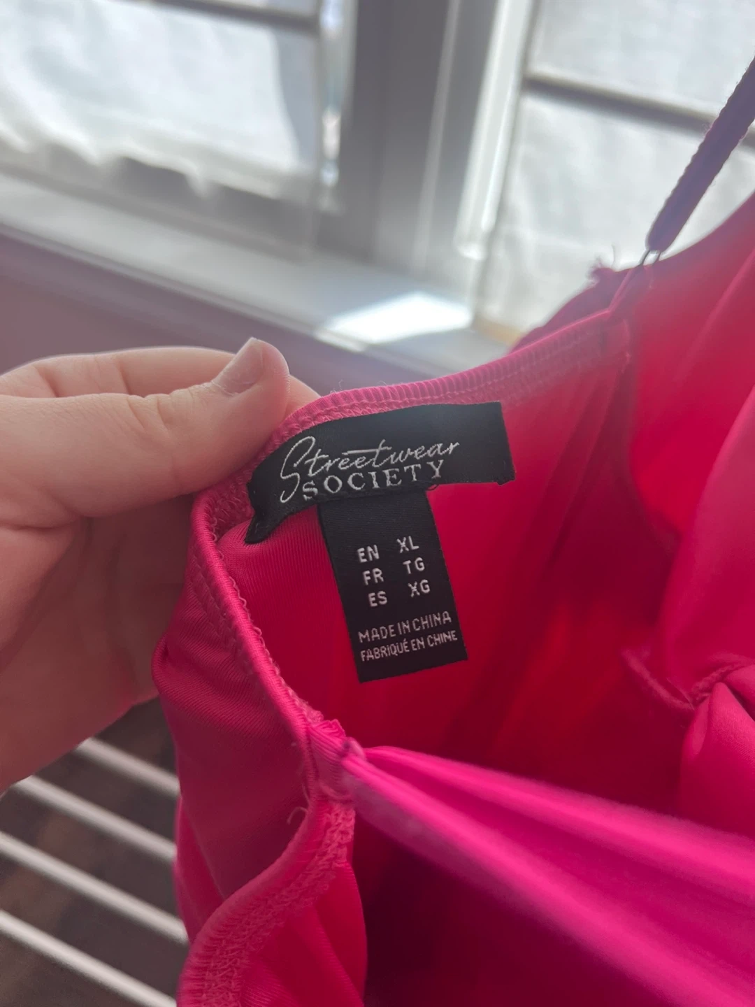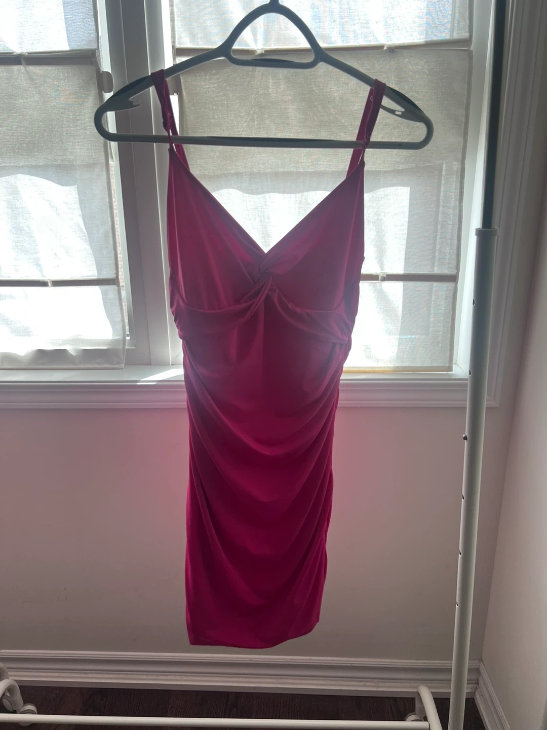 Streetwear Society pink ruched dress. It's a size XL with spaghetti straps and a V-neckline. This dress is suitable for a night out or a special occasion!
