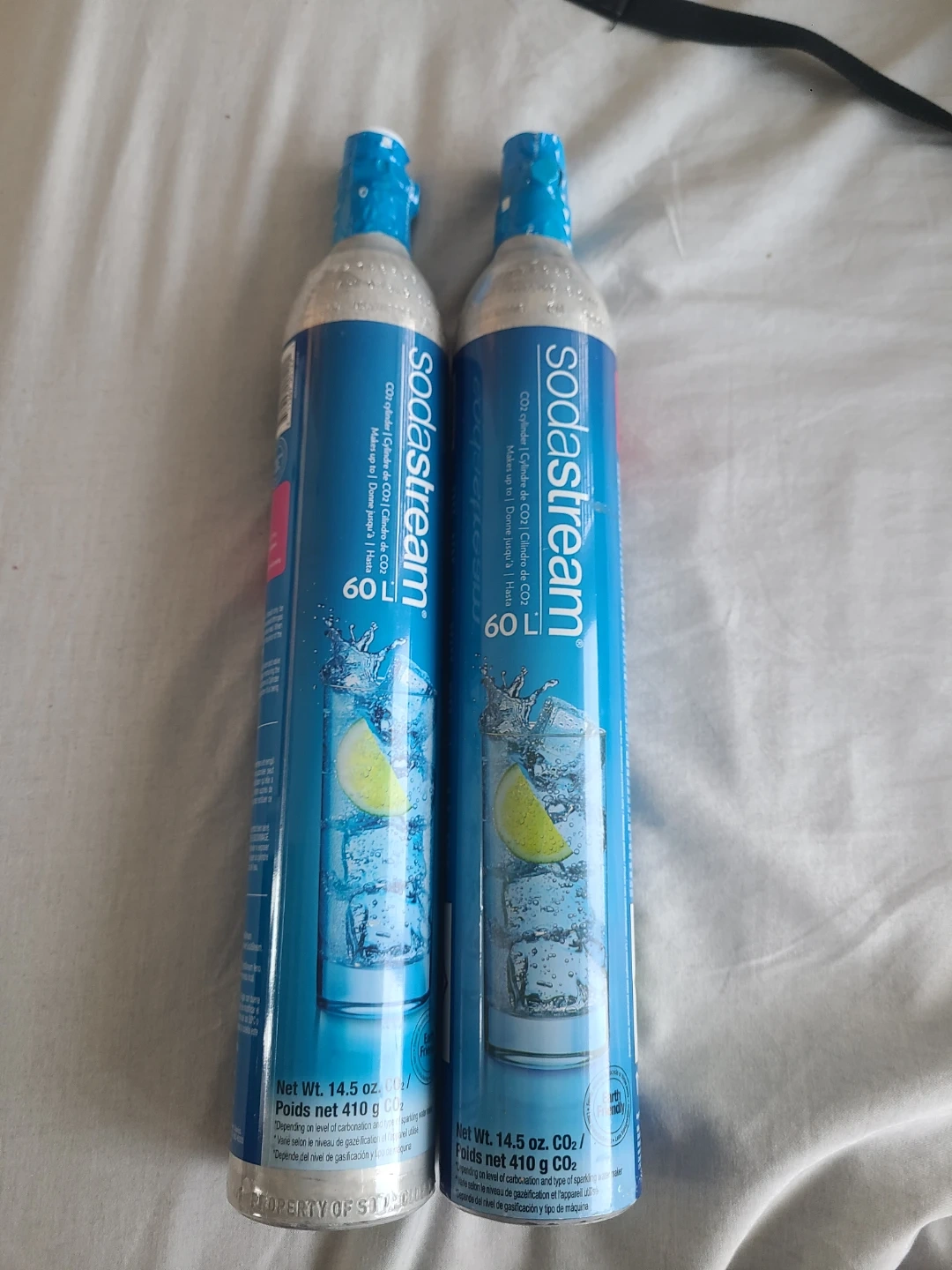 Two SodaStream 60L CO2 carbonator refill cylinders. Each cylinder contains 14.5 oz net weight (410 g) of CO2. These are screw-in type carbonators. They're for refilling your SodaStream machine. New and unused . I bought the wrong type and that is why i am selling it. Can buy one for 25 cad per item. one original price is 48 cad both together I am selling for 50 cad . Can also buy just one for 25 cad. New and unused
