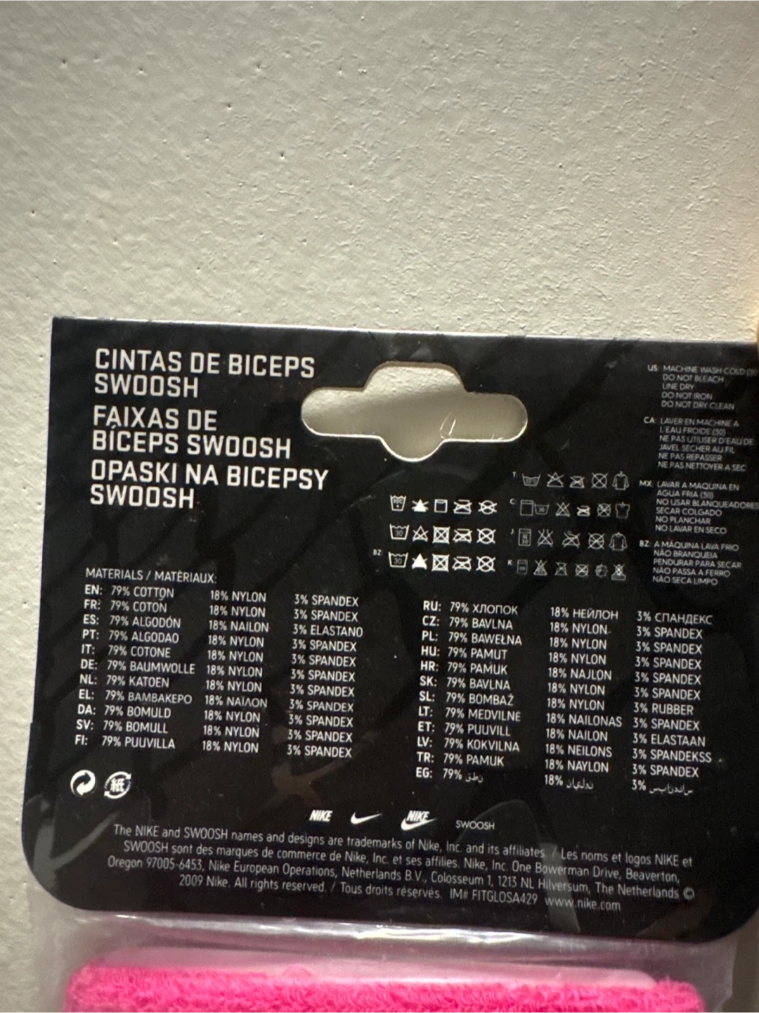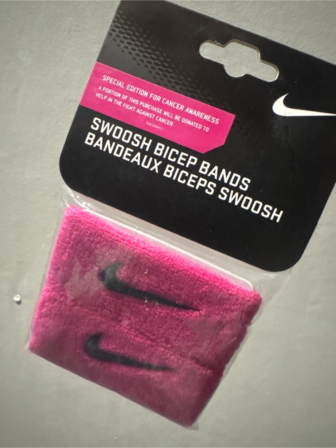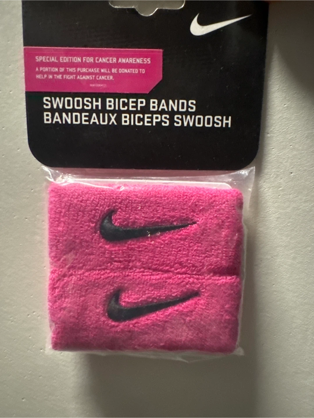 These Nike Swoosh bicep bands are new in the package! They are a special edition for cancer awareness, and a portion of the purchase will be donated to help in the fight against cancer. They are pink and made of 79% cotton, 18% nylon, and 3% spandex.