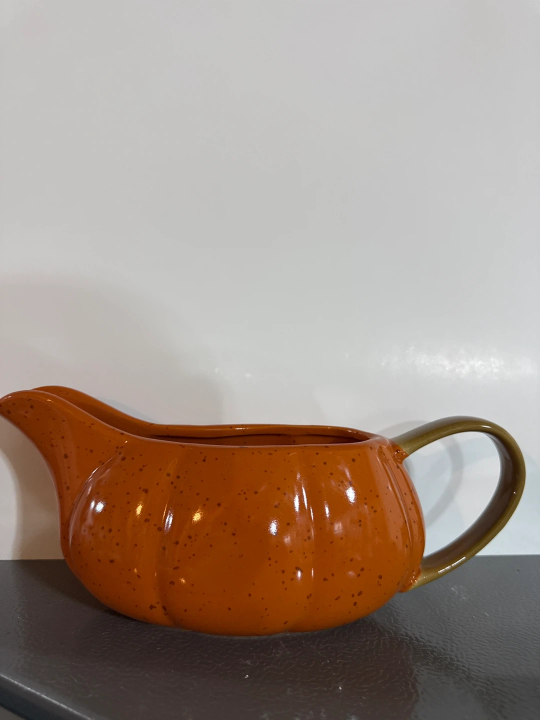 Ceramic gravy boat with a speckled orange finish. It's shaped like a pumpkin with a unique spout and handle. Dishwasher safe for easy cleanup!