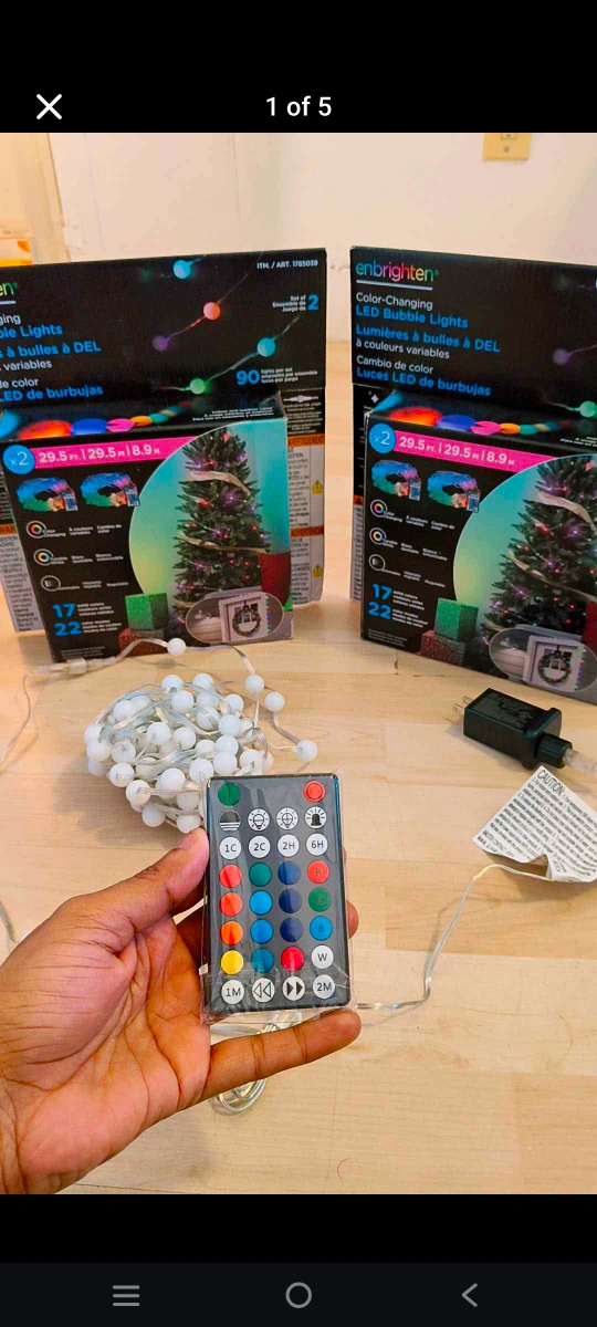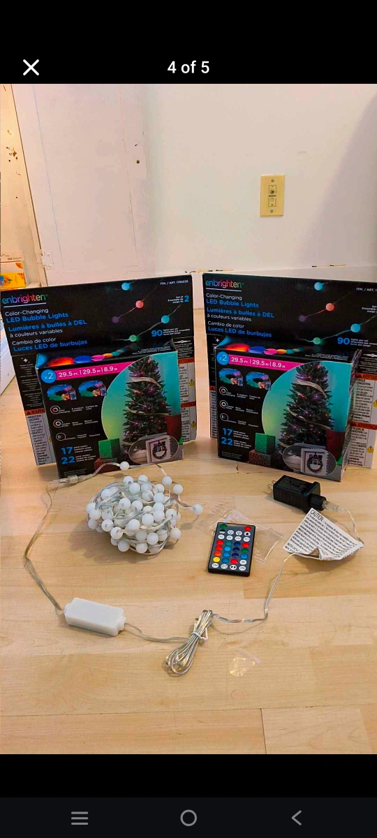 Two sets of Enbrighten colour-changing LED bubble lights. Each set includes a string of lights, remote control, and power adapter. 29.5m long. 1 One Box 15$