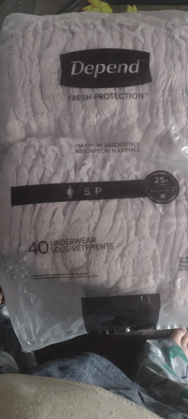 Depend Fresh Protection S/P underwear in a pack of 40. Maximum absorbency with DryShield technology that neutralizes odors. Absorbs 25x its weight.. They can also be used as a child Pull-up in a Pinch. It was free to me so now l will give back free