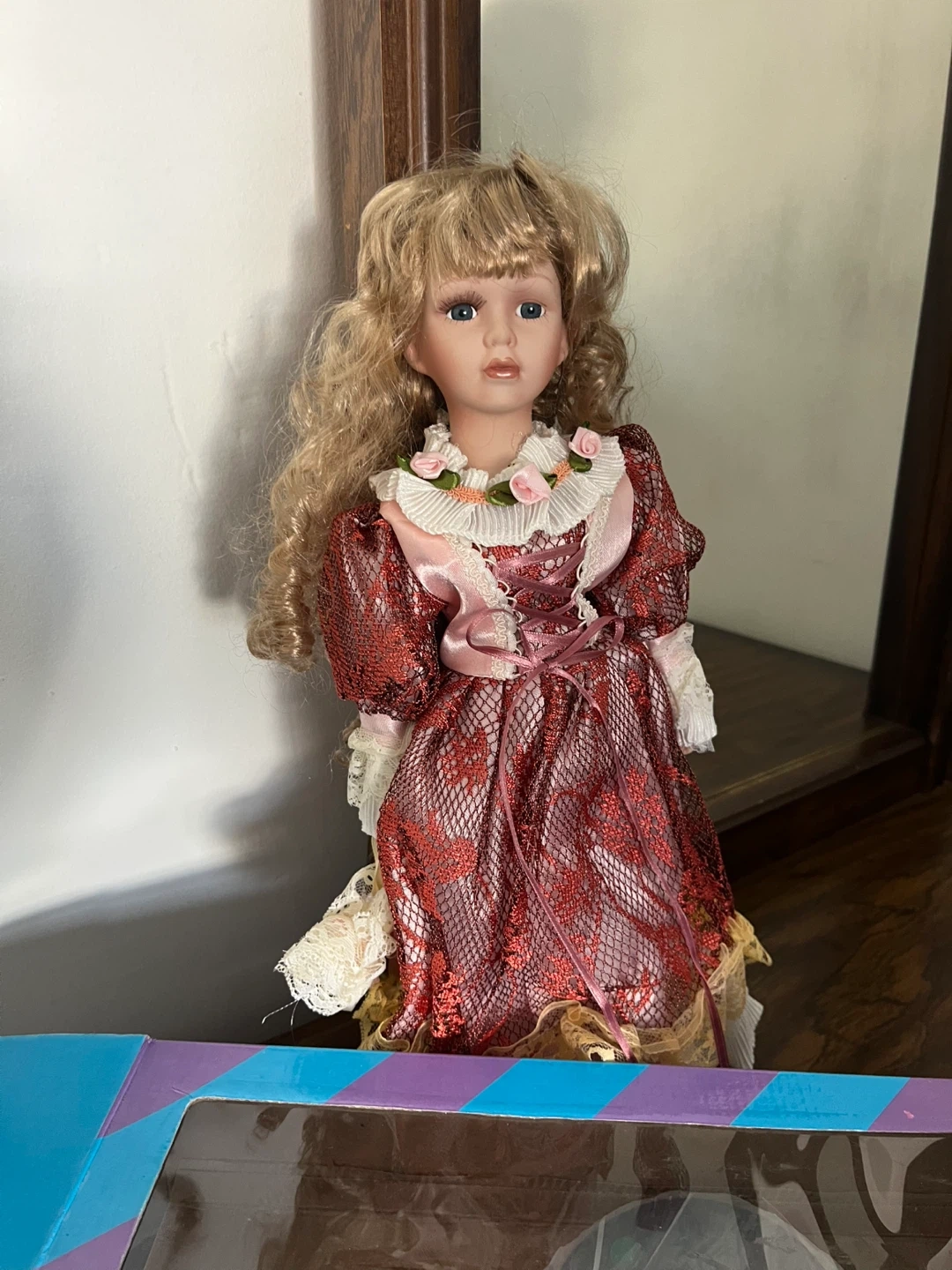 This is a collectible porcelain doll with blonde hair. She's wearing an intricate red lace dress with lace trim and pink ribbon accents. This doll would make a lovely display piece.