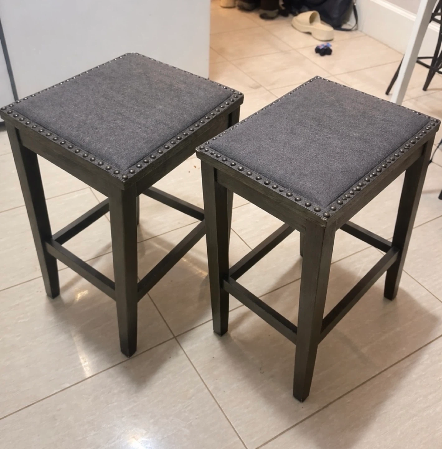 This is a set of two grey upholstered counter stools. They feature a dark wood base with nailhead trim detail. Perfect for your kitchen island or bar area!
