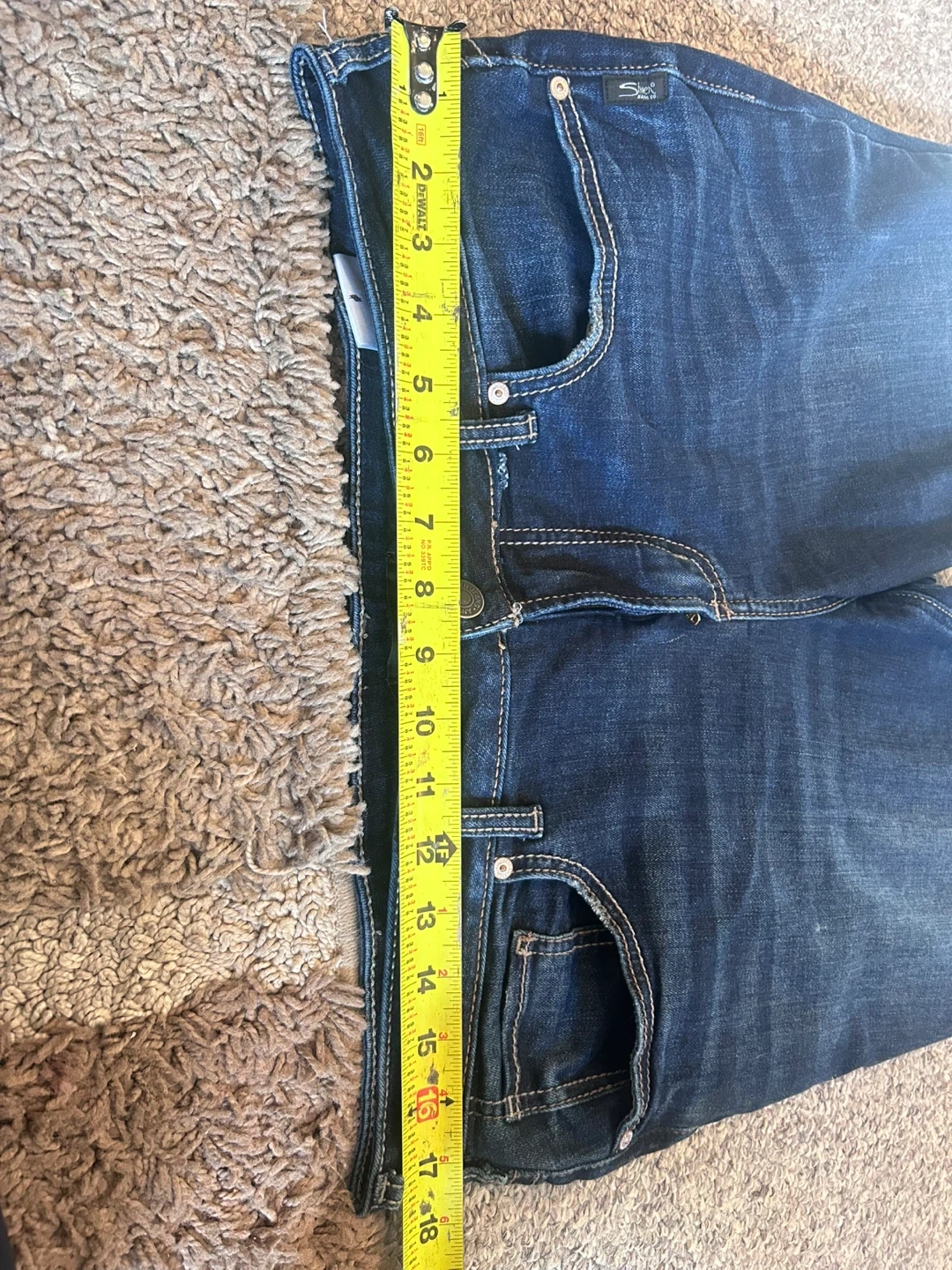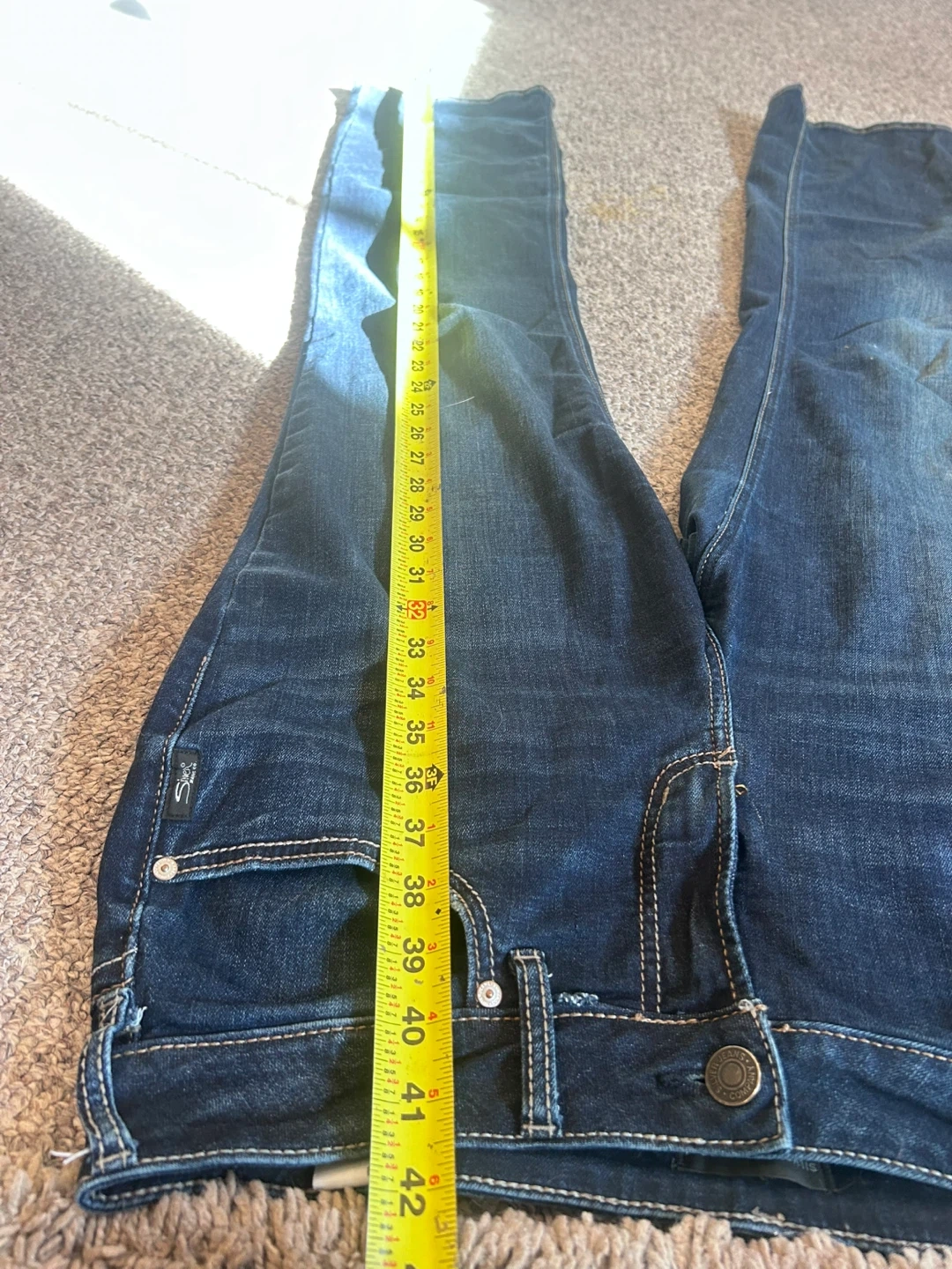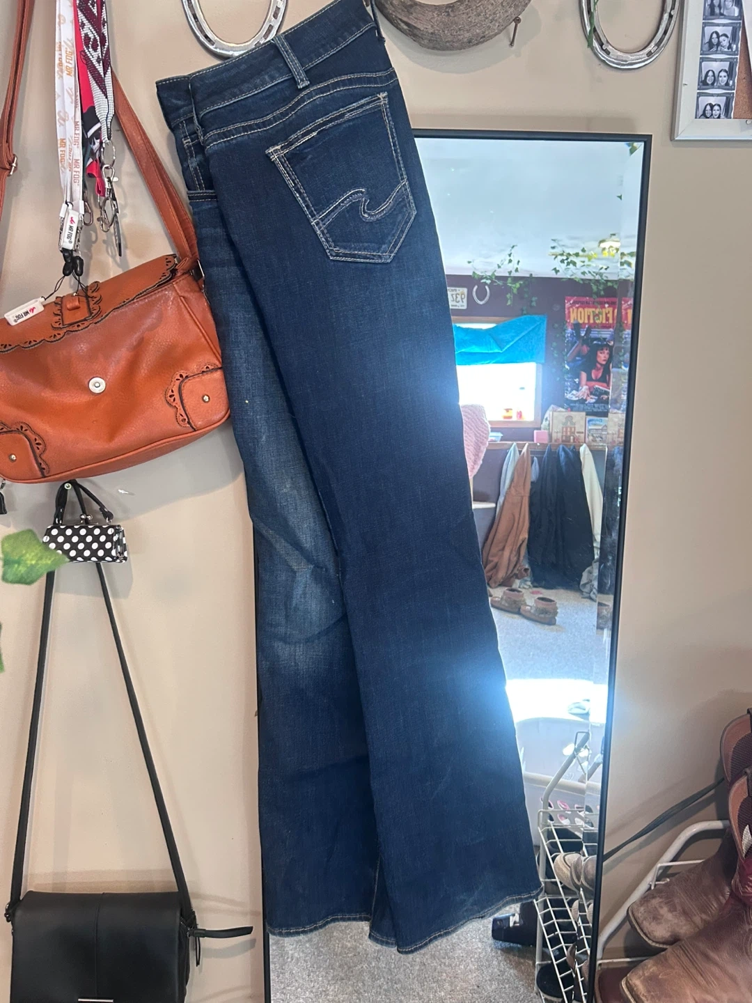 Dark wash denim jeans by Silver Jeans Co. Features a bootcut style. Waist measures approximately 18 inches across. Inseam measures approximately 42 inches. Originally bought for 90$