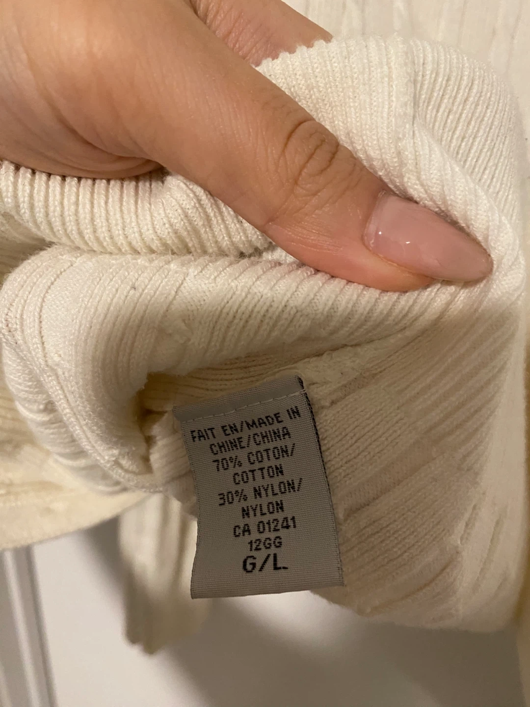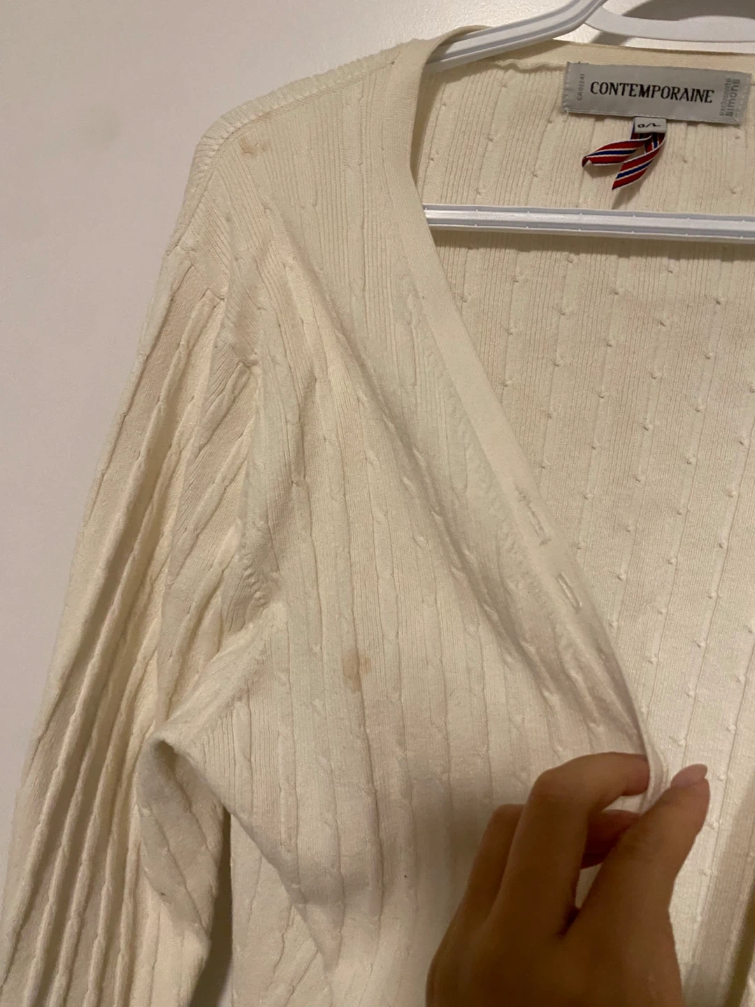 Cream cable knit cardigan from Contemporaine. It's a size G/L and made of 70% cotton and 30% nylon. There are some light stains on the front and sleeve. As is.