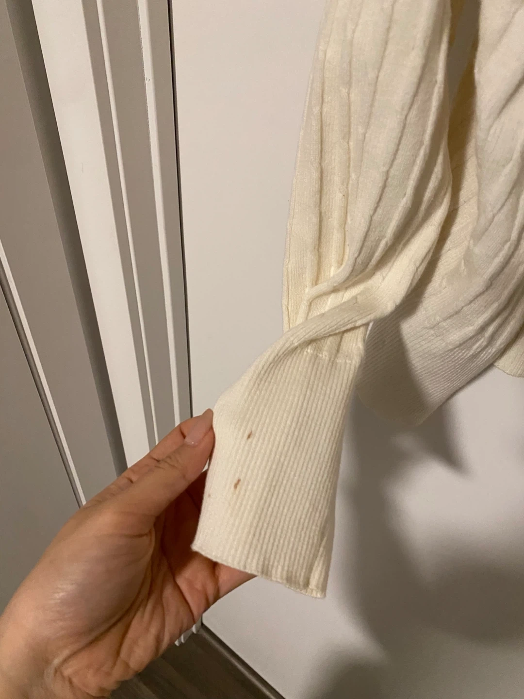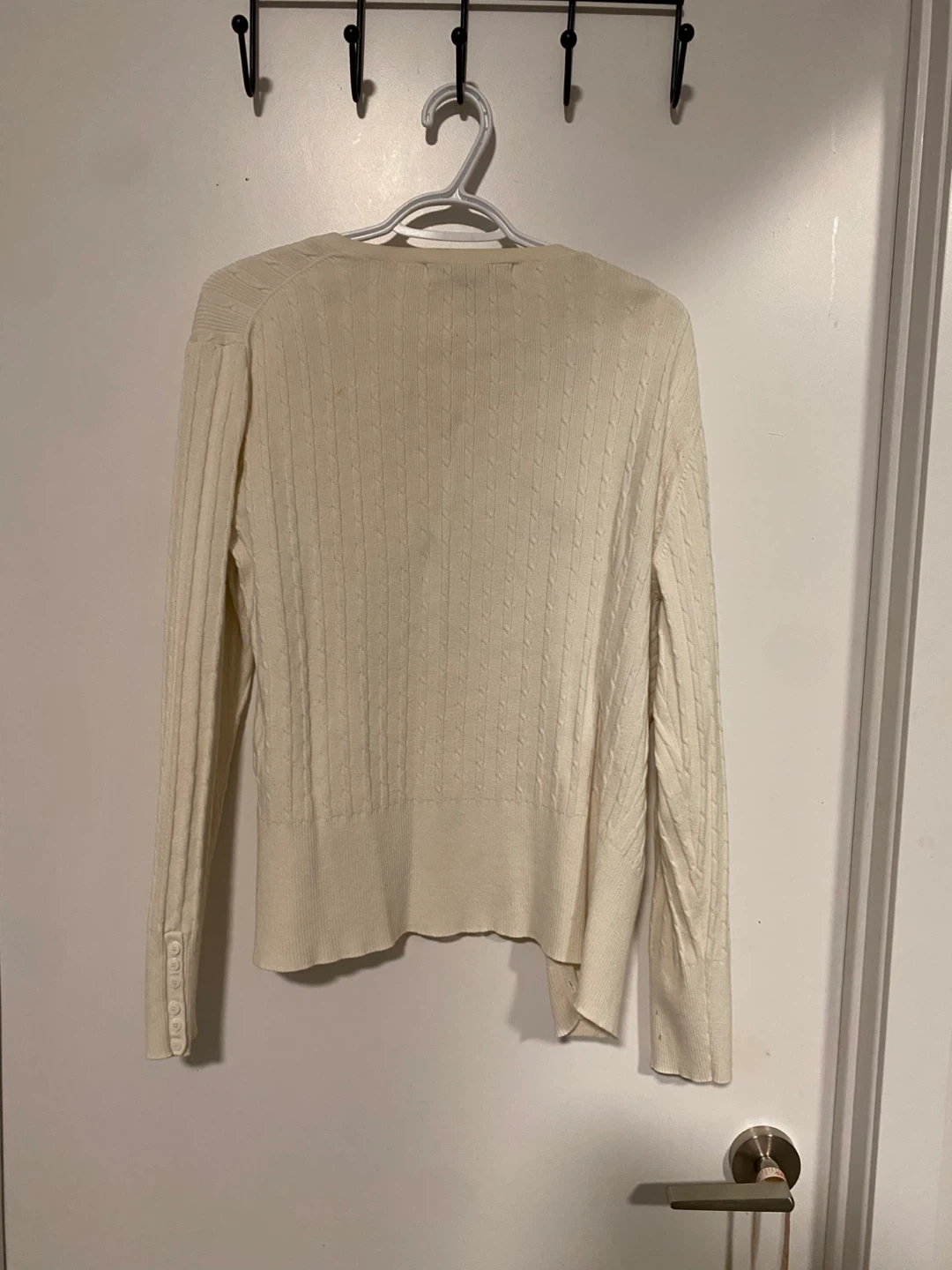 Cream cable knit cardigan from Contemporaine. It's a size G/L and made of 70% cotton and 30% nylon. There are some light stains on the front and sleeve. As is.