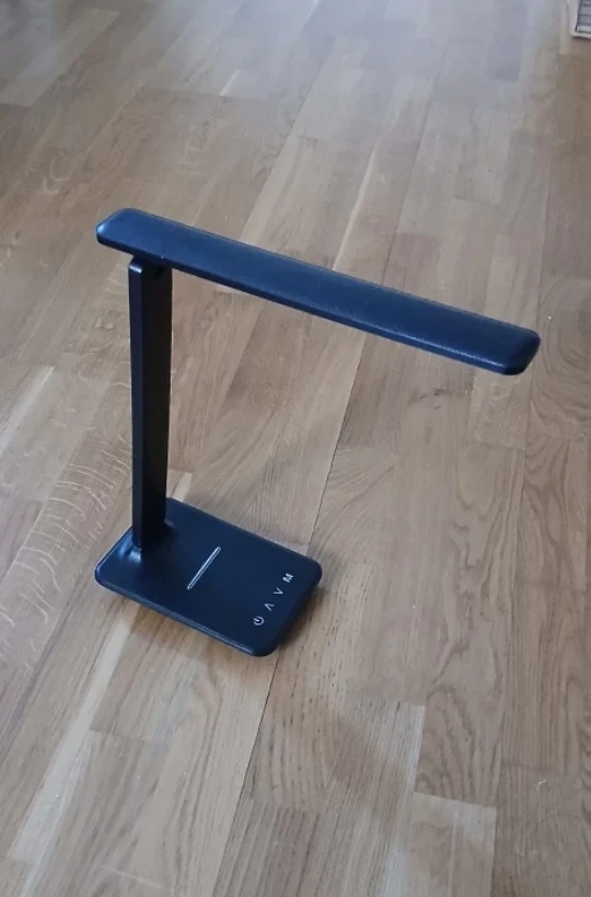 This is a black LED desk lamp. It's adjustable and has touch controls on the base. It features two USB ports to connect to the wall (it'snot wireless, needs to be plugged in).