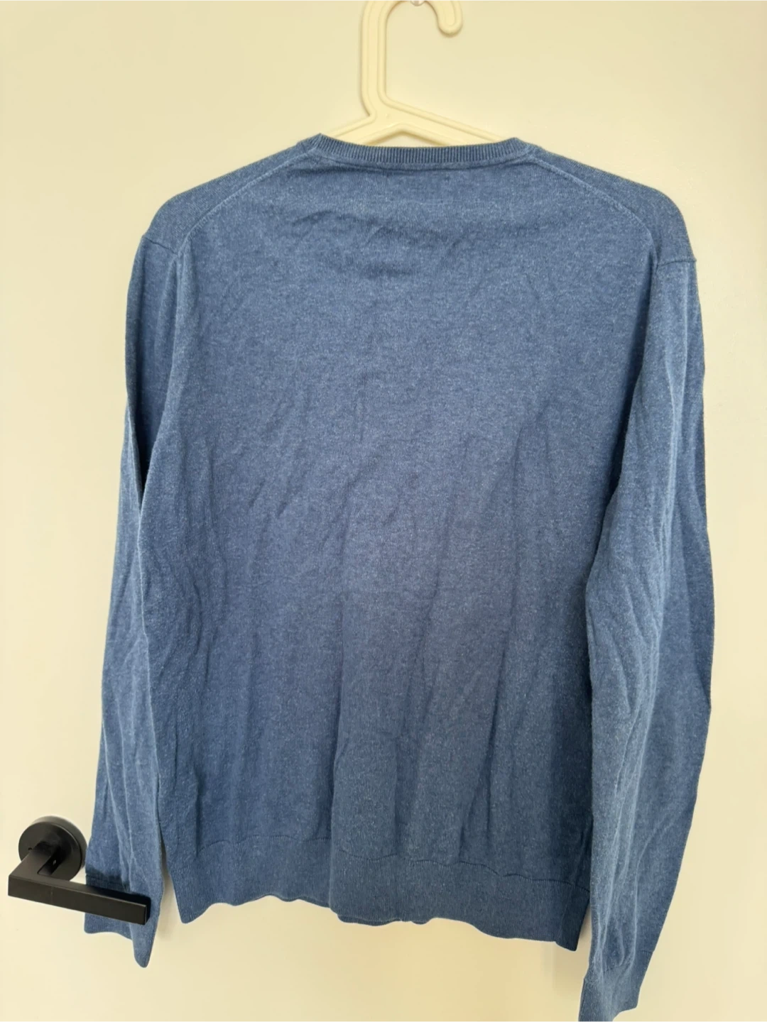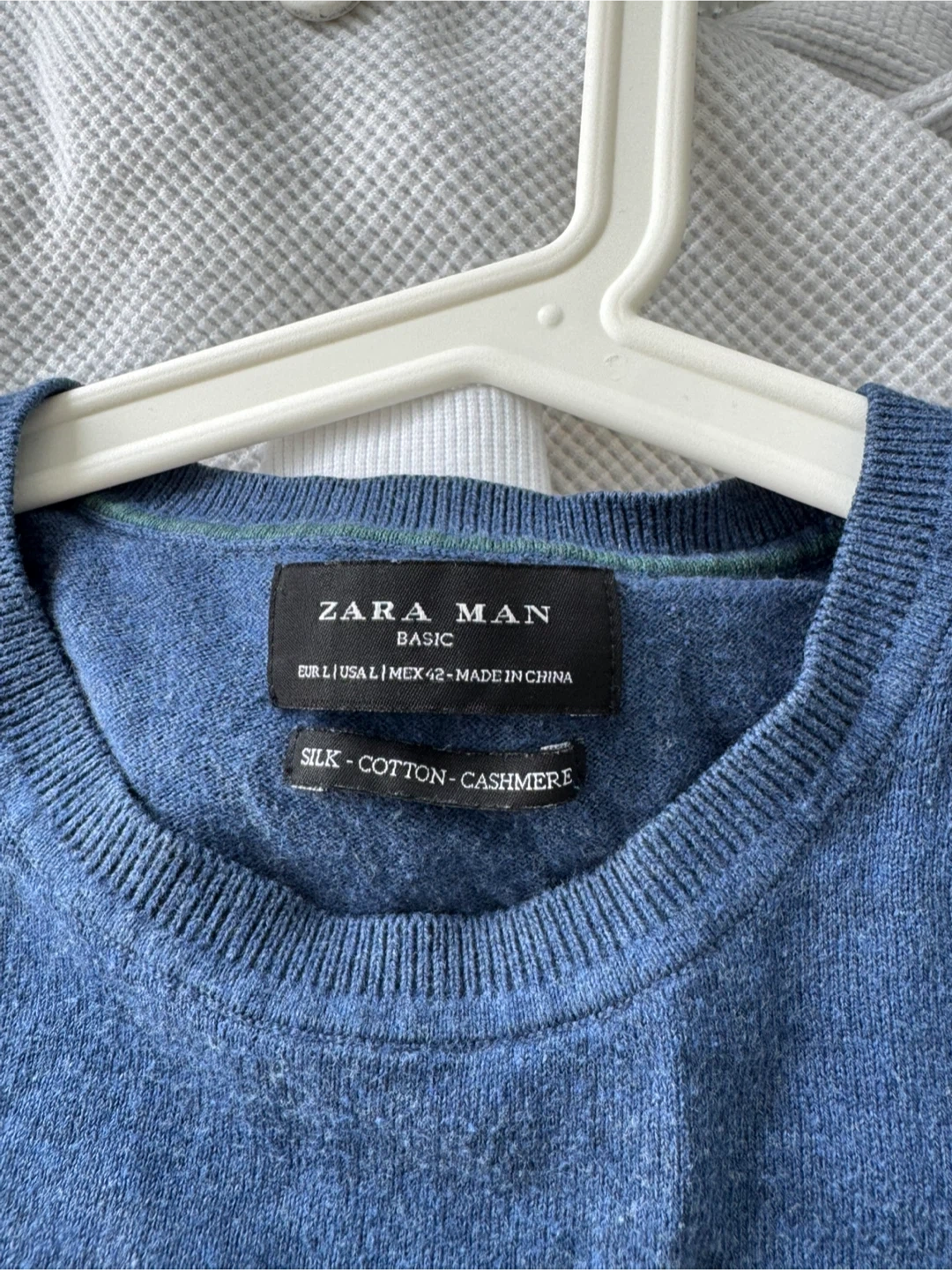 ZARA MAN basic crewneck sweater in a blue hue. It's made from a silk, cotton, and cashmere blend. The sweater is size L with measurements EUR/USA L, MEX 42.