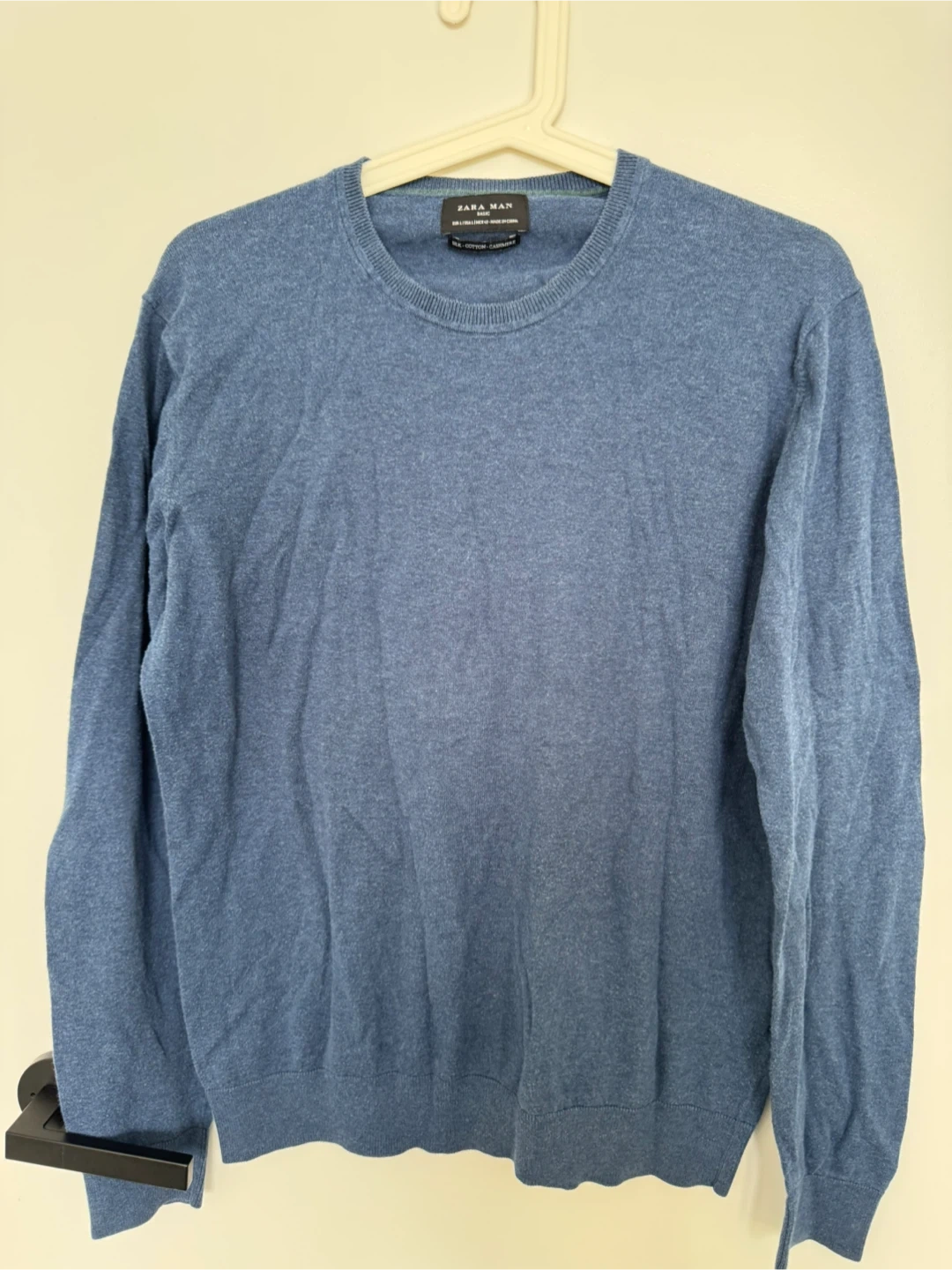 ZARA MAN basic crewneck sweater in a blue hue. It's made from a silk, cotton, and cashmere blend. The sweater is size L with measurements EUR/USA L, MEX 42.