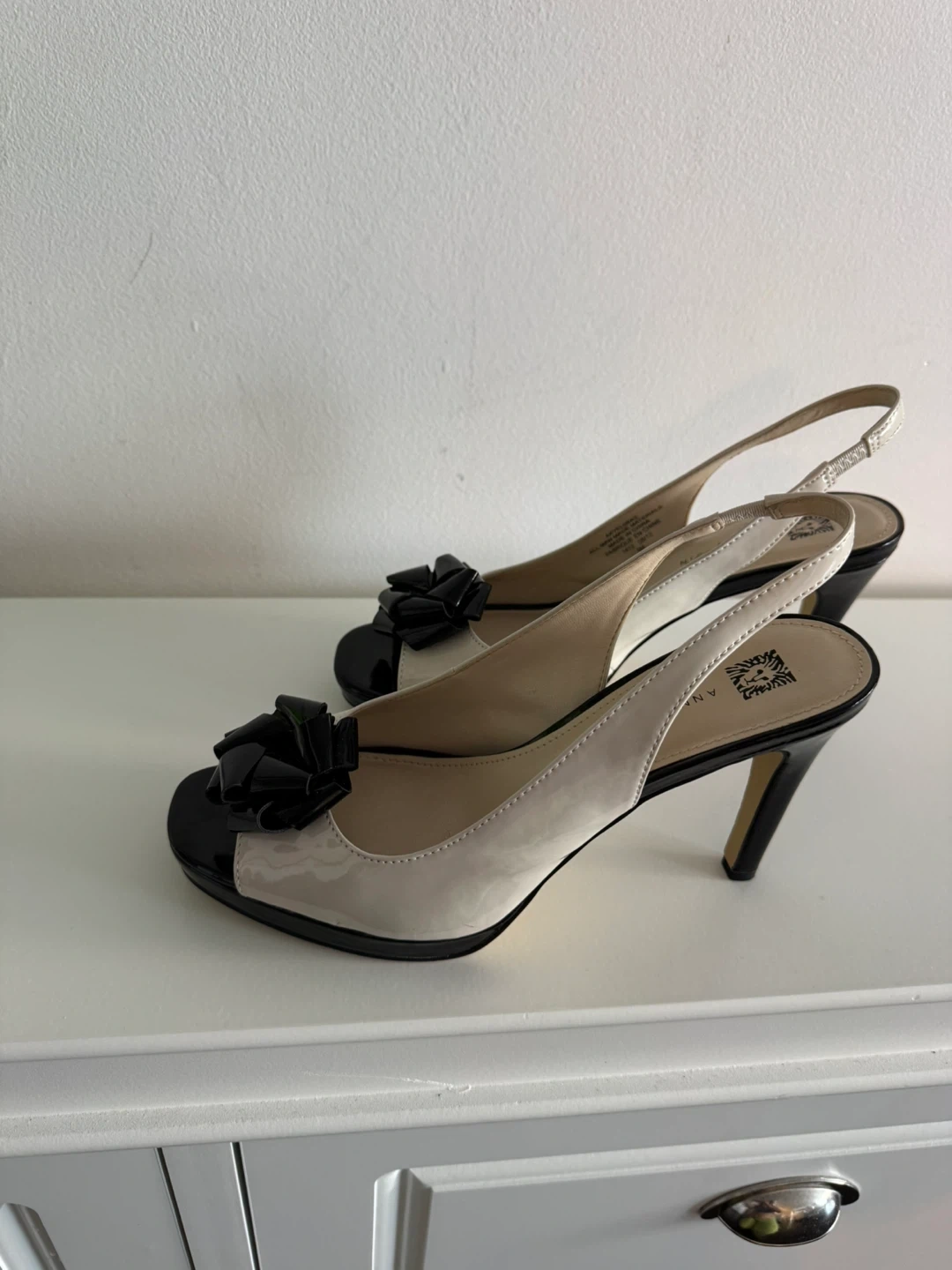 These Anne Klein slingback heels feature a patent black toe and bow detail. The shoe is a cream colour with black accents. They come with the original box. Step out in style with these Anne Klein heels, size 8, featuring a chic black flower detail and a sleek slingback design.