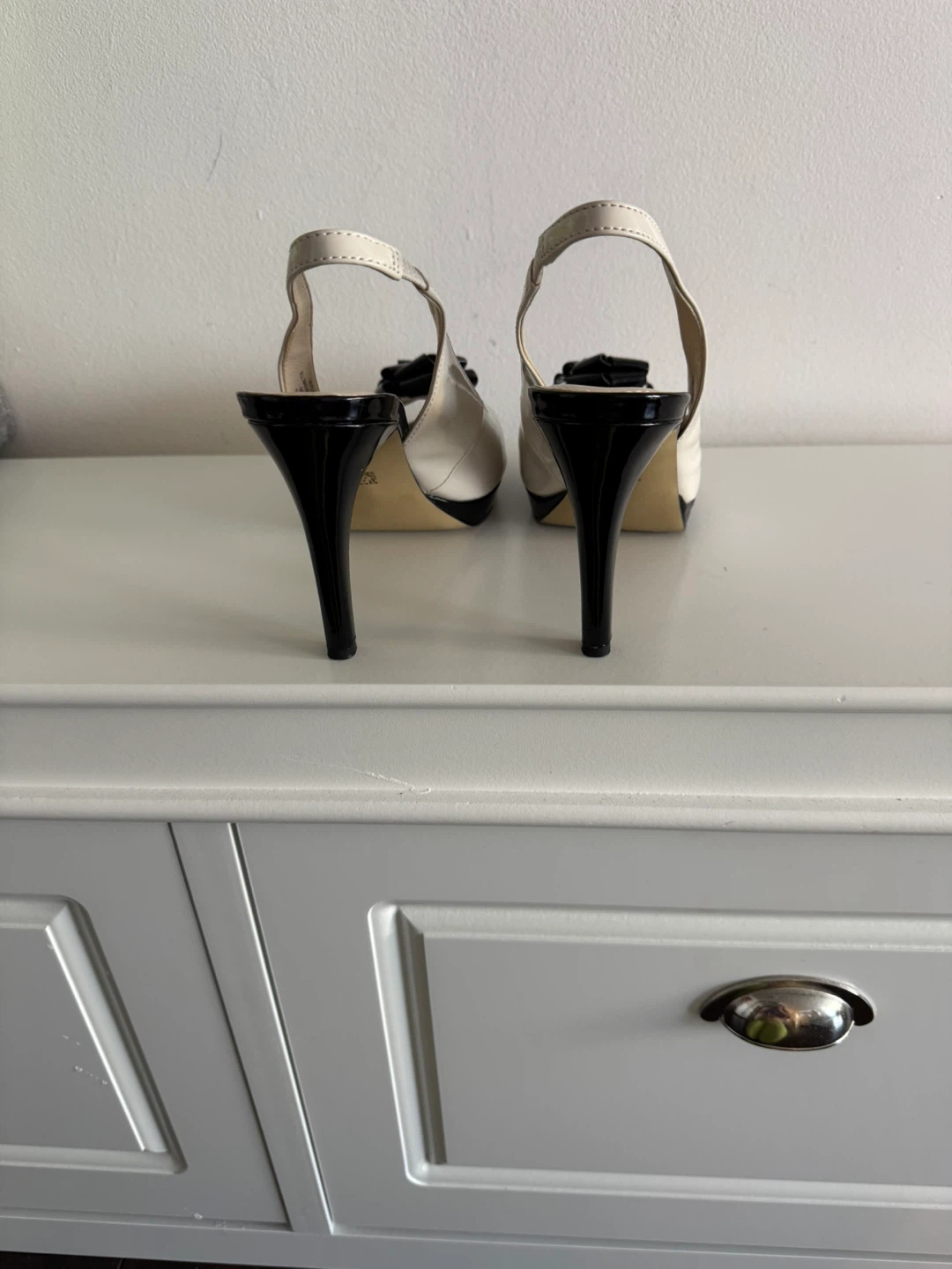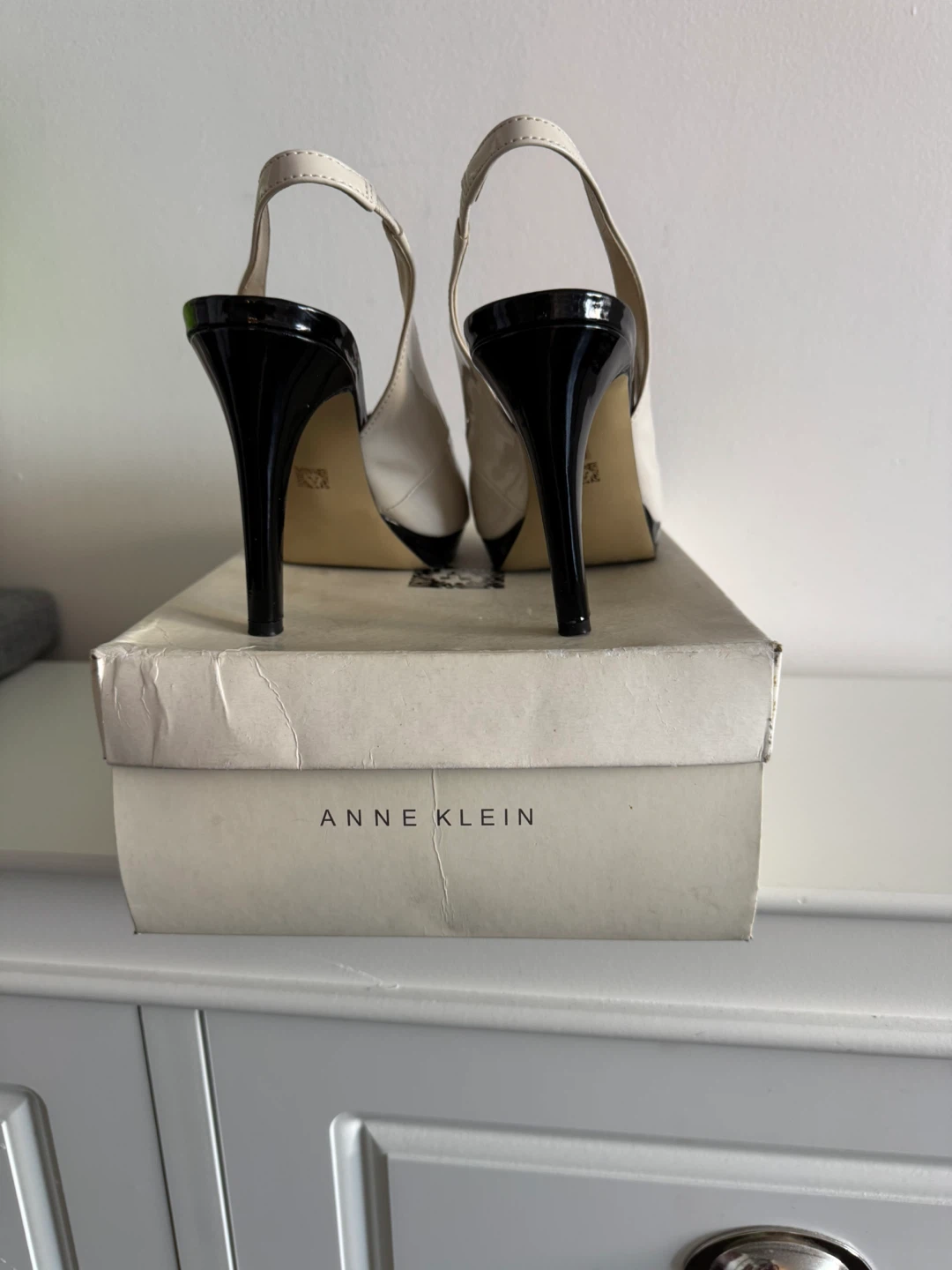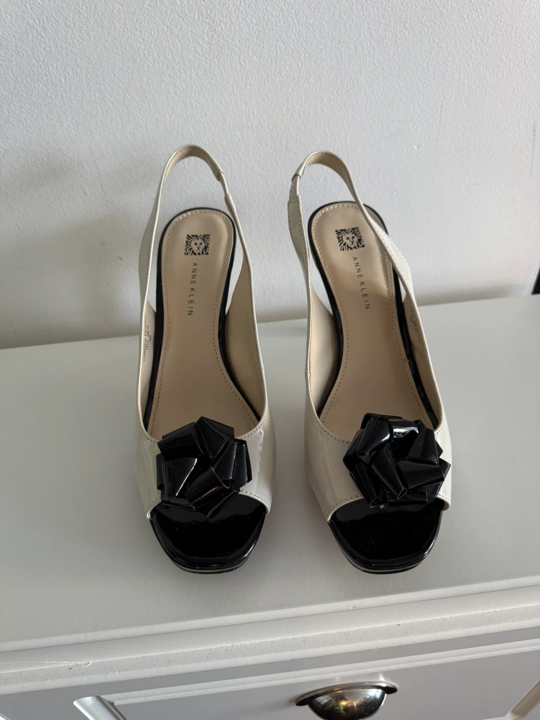 These Anne Klein slingback heels feature a patent black toe and bow detail. The shoe is a cream colour with black accents. They come with the original box. Step out in style with these Anne Klein heels, size 8, featuring a chic black flower detail and a sleek slingback design.