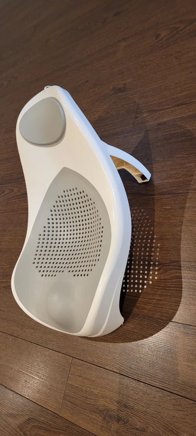 This is a white and grey Fisher-Price bath support for newborns. It's designed to help keep babies secure and comfortable during bath time. The perforated surface allows water to drain easily.