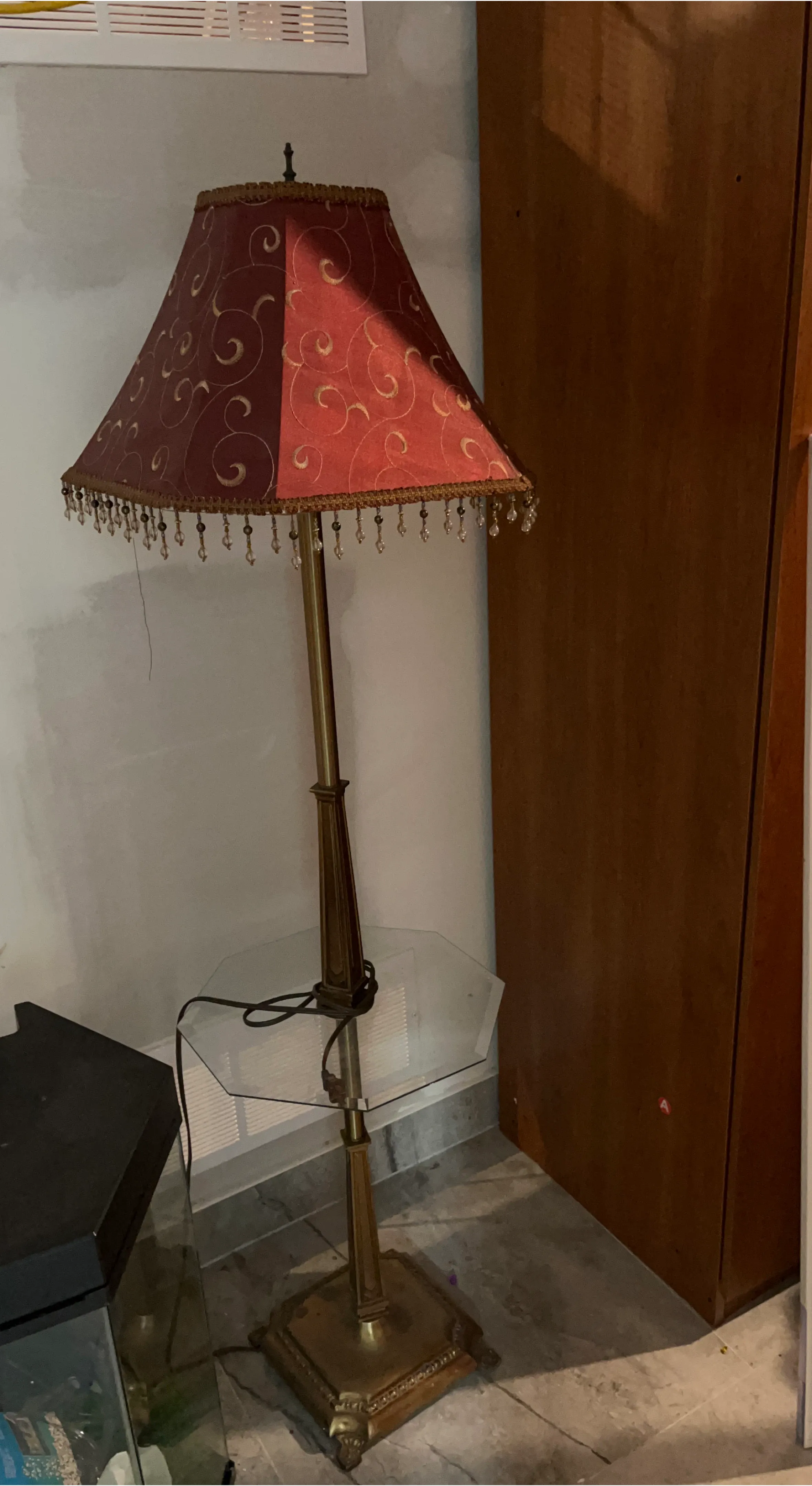 This floor lamp features a decorative red shade with a swirling gold pattern and beaded fringe. It has a brass-tone metal pole and a square base. A hexagonal glass table is attached to the pole, perfect for holding a drink or small item. This lamp's style adds a touch of classic elegance to any room.