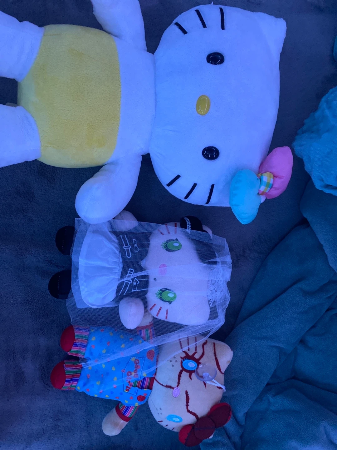 Two Hello Kitty plush toys are up for grabs. One is dressed as a bride with a veil, and the other is styled after Chucky with overalls and stitches. They're super soft and would make a fun addition to any collection!
