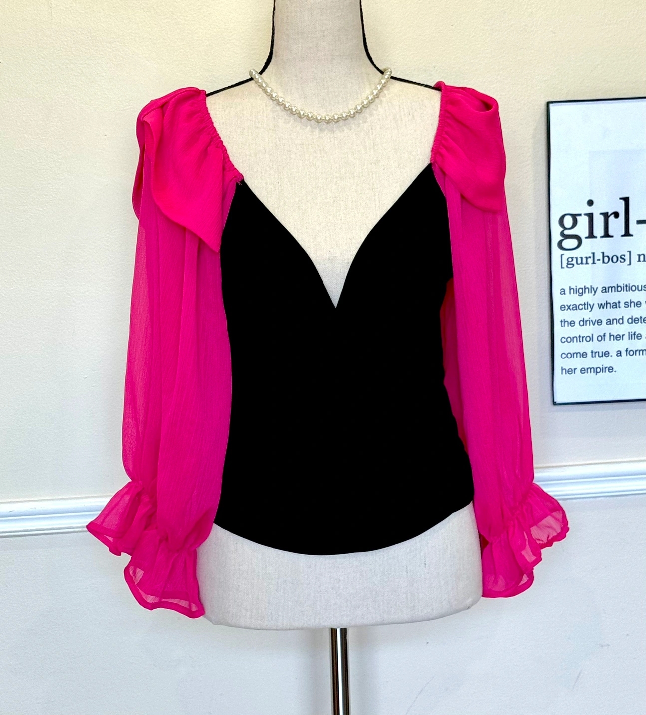 A black velvet top with pink, sheer long sleeves. The top features a deep V-neckline.