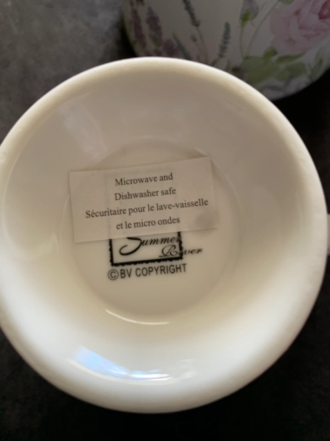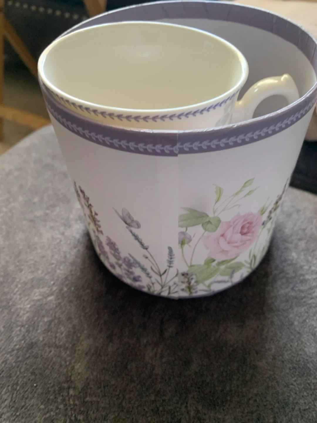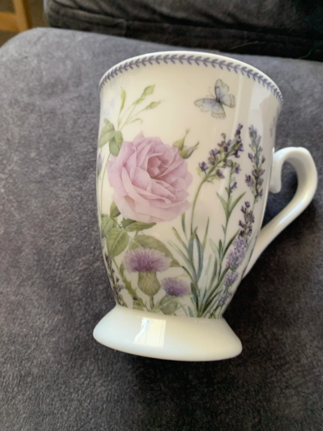 This is a lovely ceramic mug with a floral and butterfly design. It's microwave and dishwasher safe for easy use. Perfect for enjoying your morning tea or coffee!