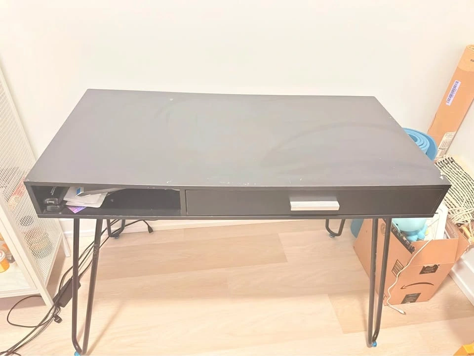 Black SHW computer desk. Has cool hairpin legs and a drawer for storage. Also has an open cubby on the left side. Great for a home office or small space. Pick up only. King and Sackville (Toronto).