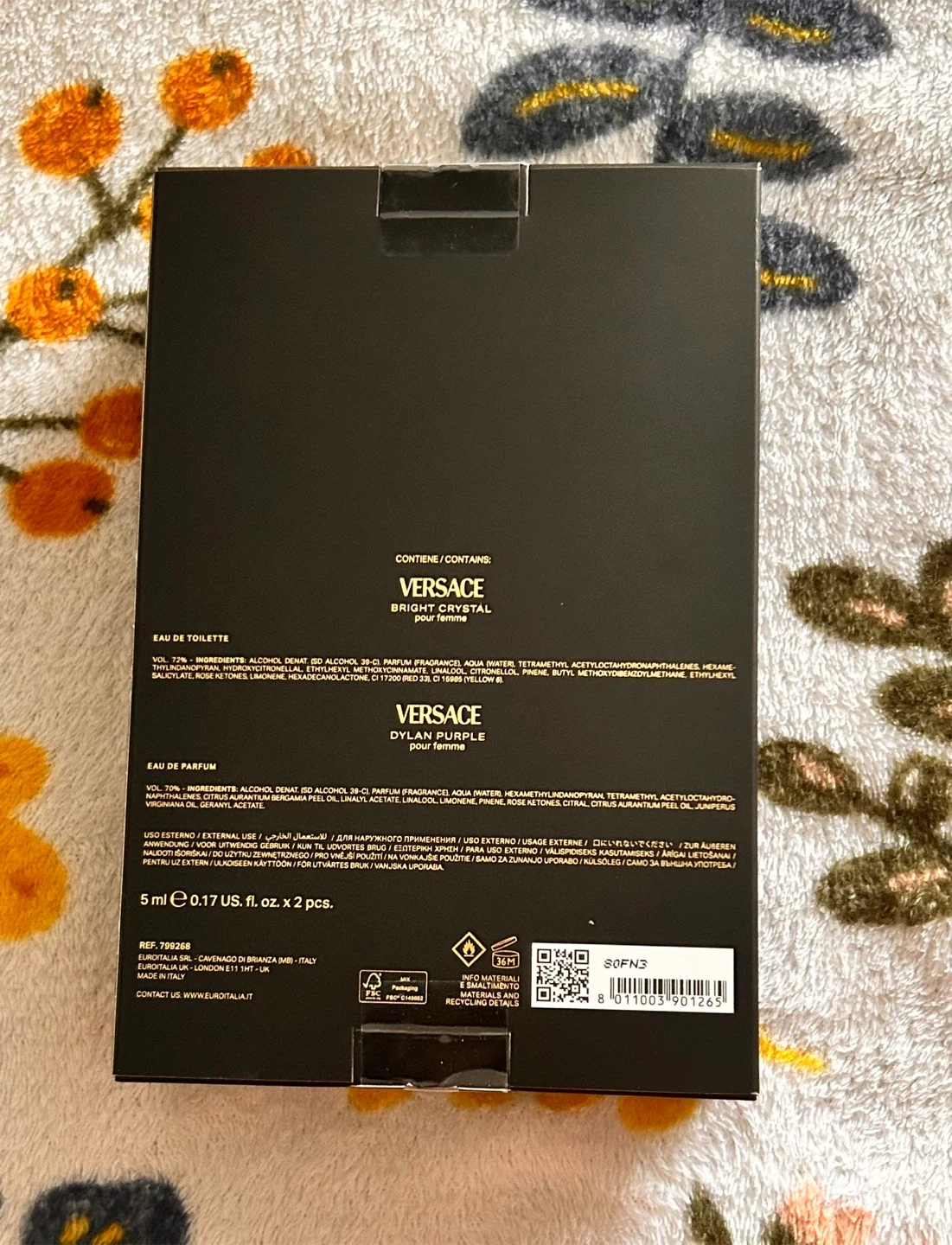 Selling a Versace perfume set that includes Bright Crystal Eau de Toilette (5 ml) and Dylan Purple Eau de Parfum (5 ml). Comes in the original box, perfect for gifting or travel.