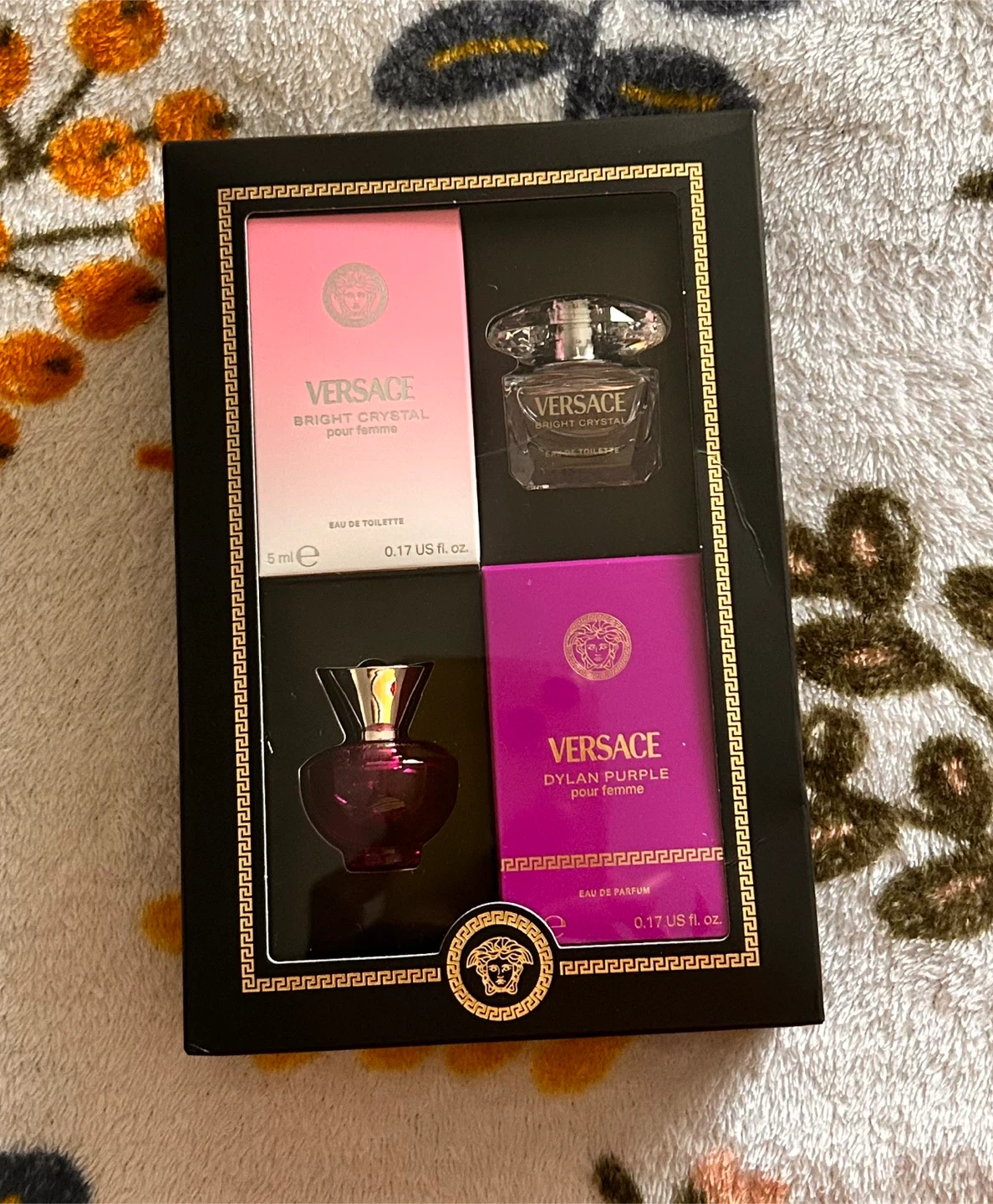 Selling a Versace perfume set that includes Bright Crystal Eau de Toilette (5 ml) and Dylan Purple Eau de Parfum (5 ml). Comes in the original box, perfect for gifting or travel.