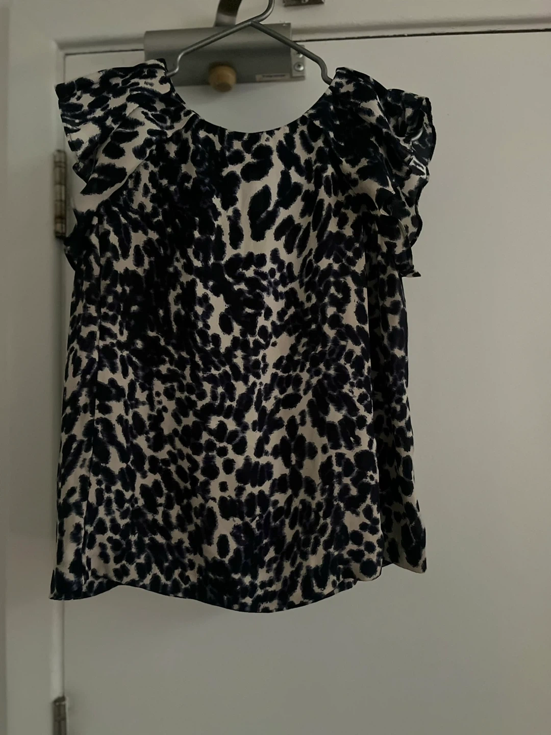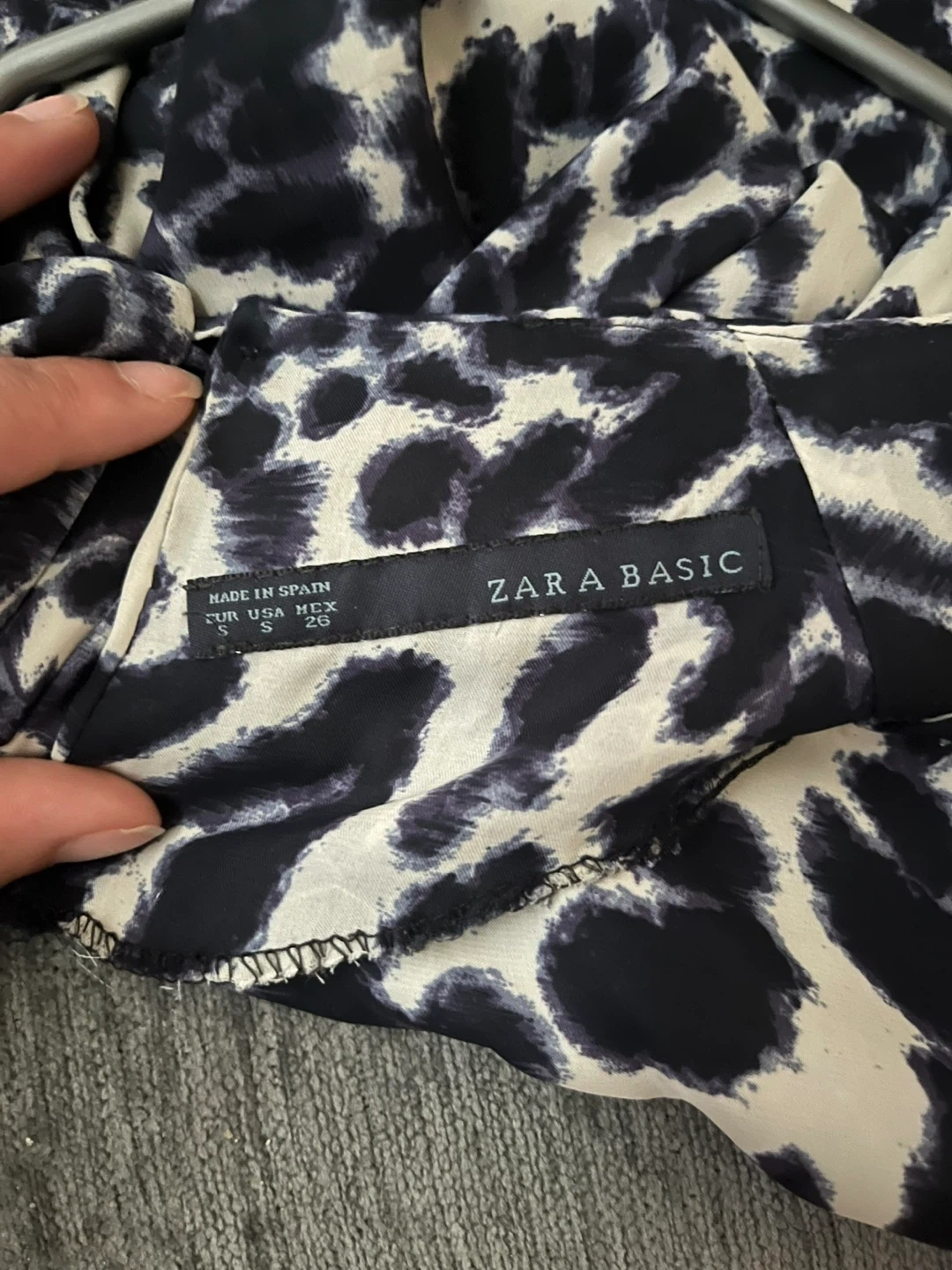 This Zara Basic blouse features a bold leopard print with ruffled sleeves. It's made of 100% polyester and was manufactured in Spain. It's perfect for adding a stylish touch to your outfit!