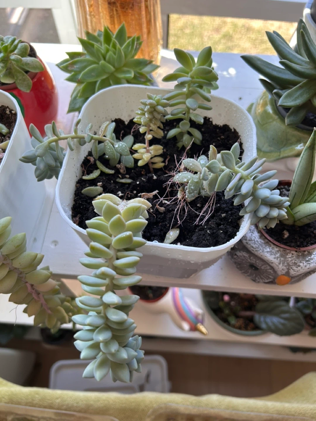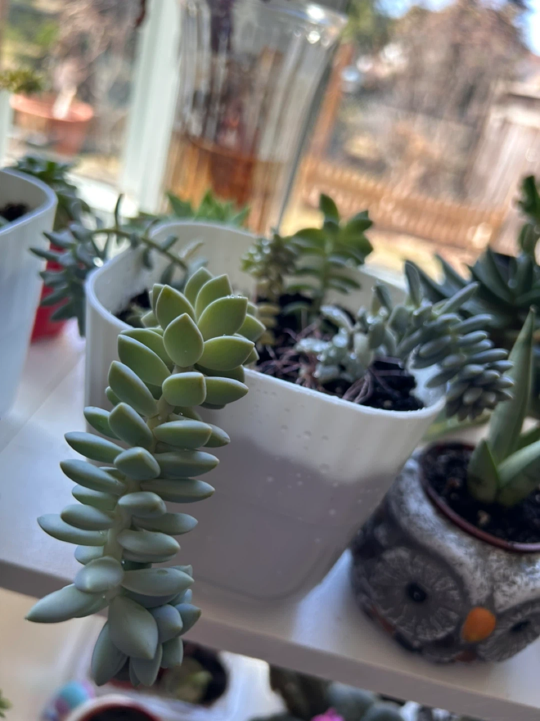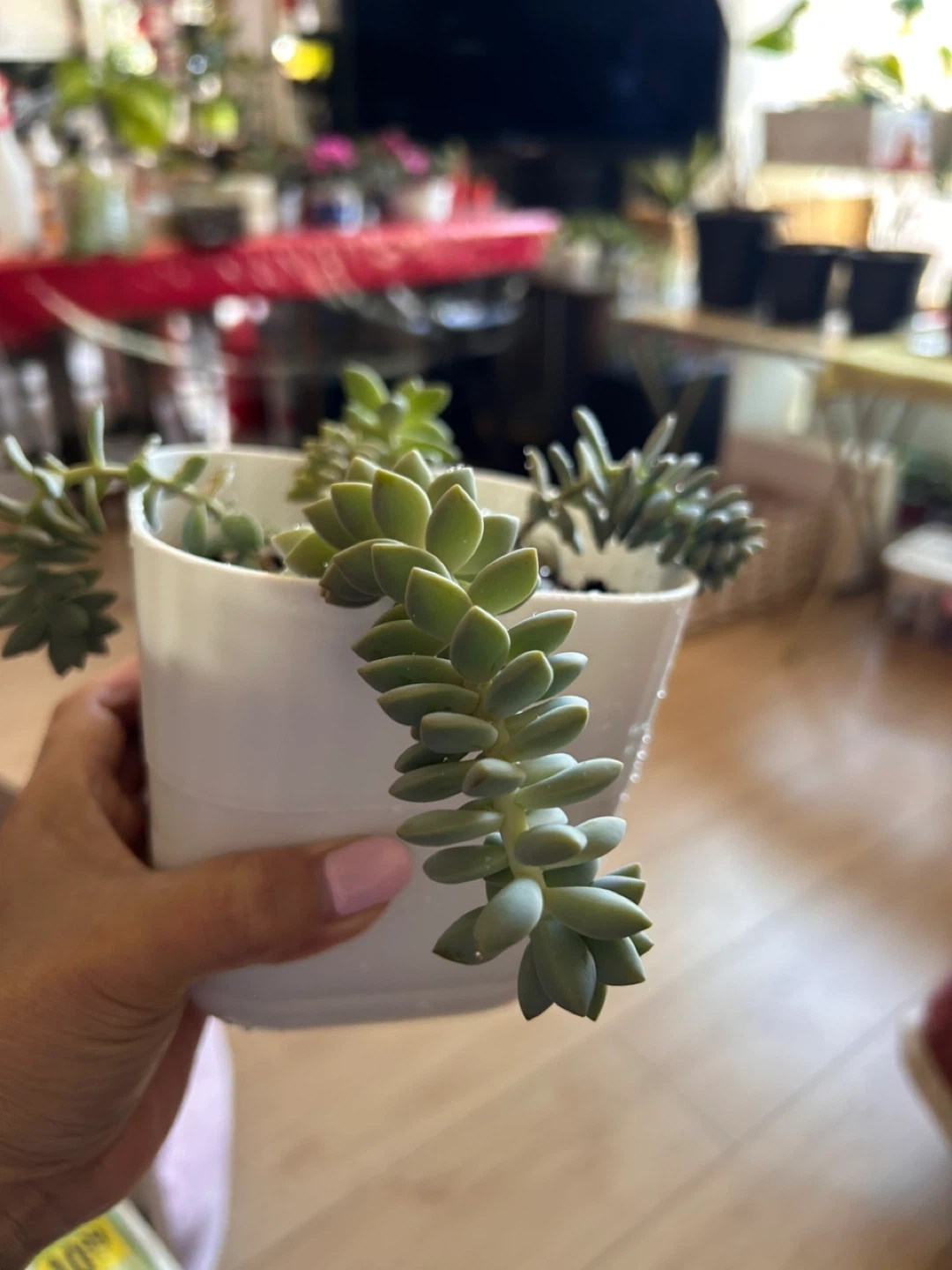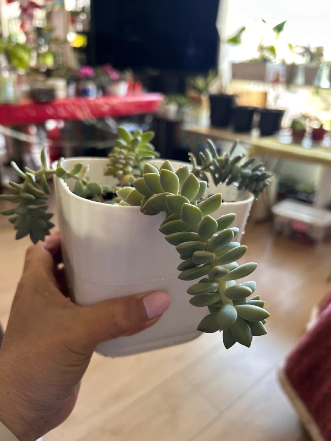 A healthy Burro's Tail succulent plant in a white pot. It's a trailing plant with unique plump leaves. Needs bright light and infrequent watering.