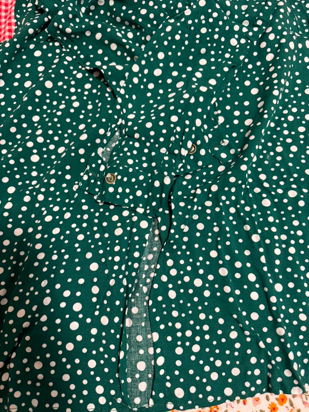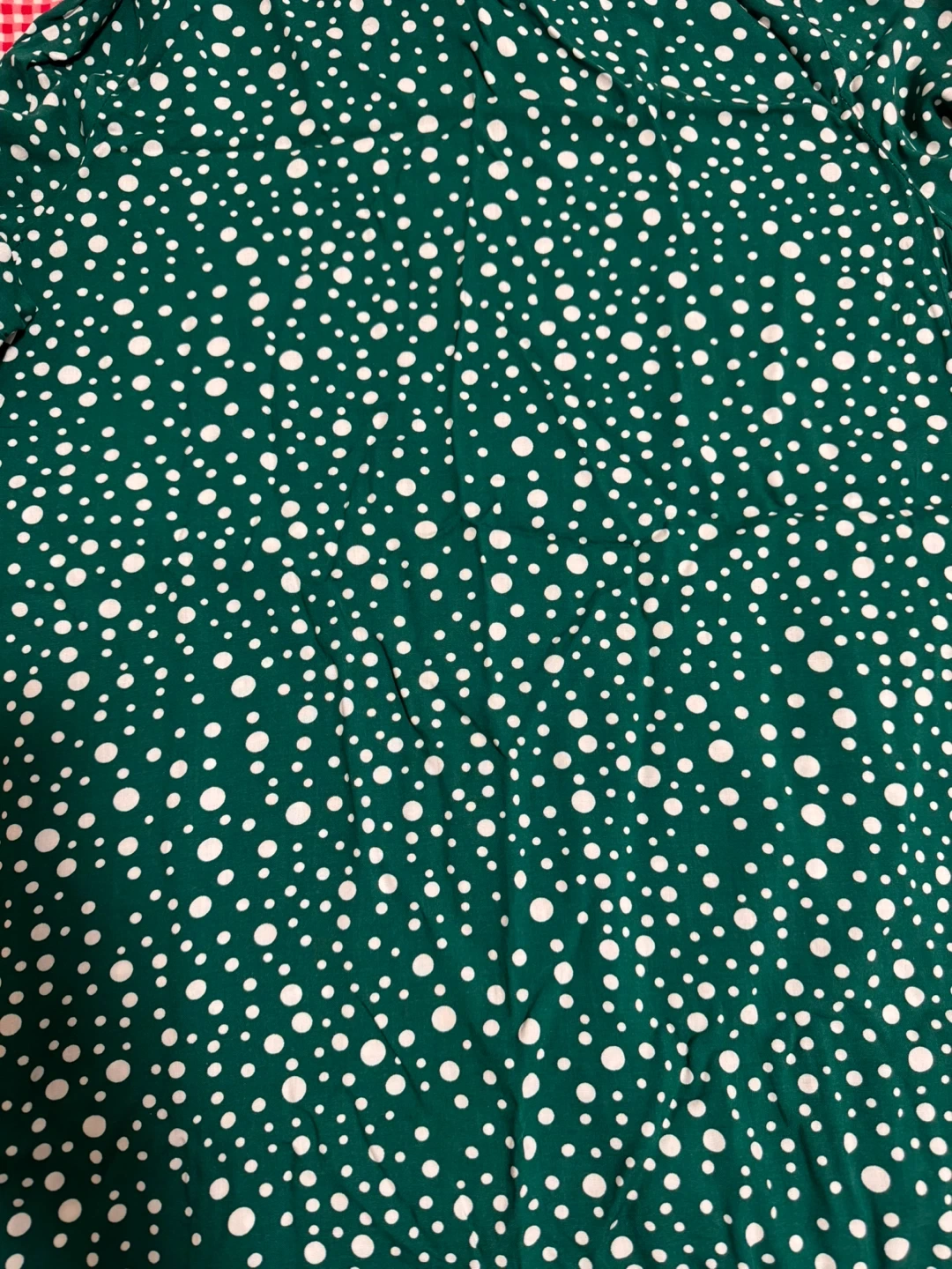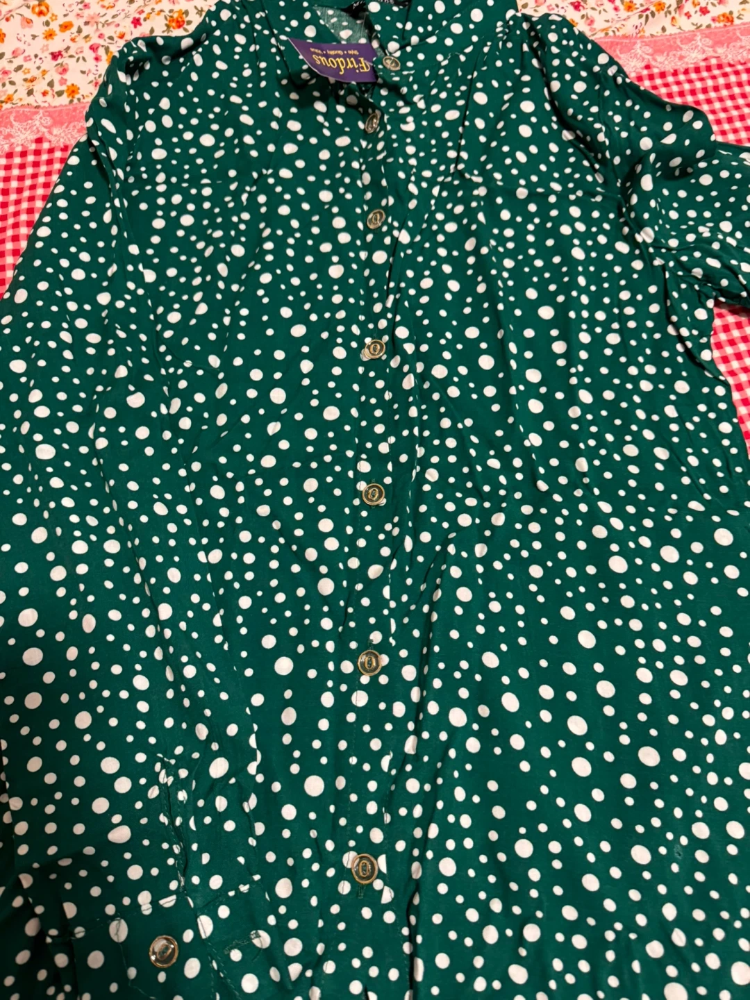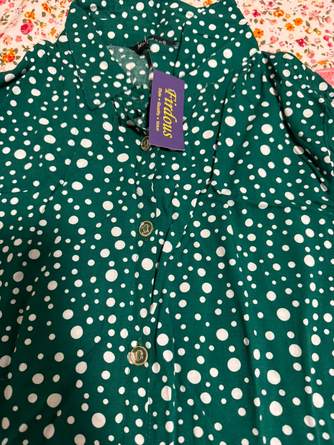 This Firdous button-up shirt is green with a white polka dot pattern. It features a classic collar and gold-toned buttons. It's a stylish piece for any casual occasion! It’s very soft and comfortable