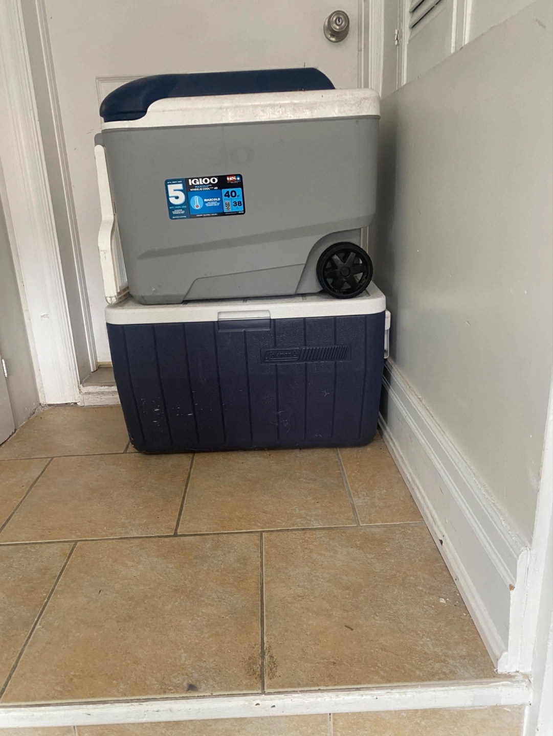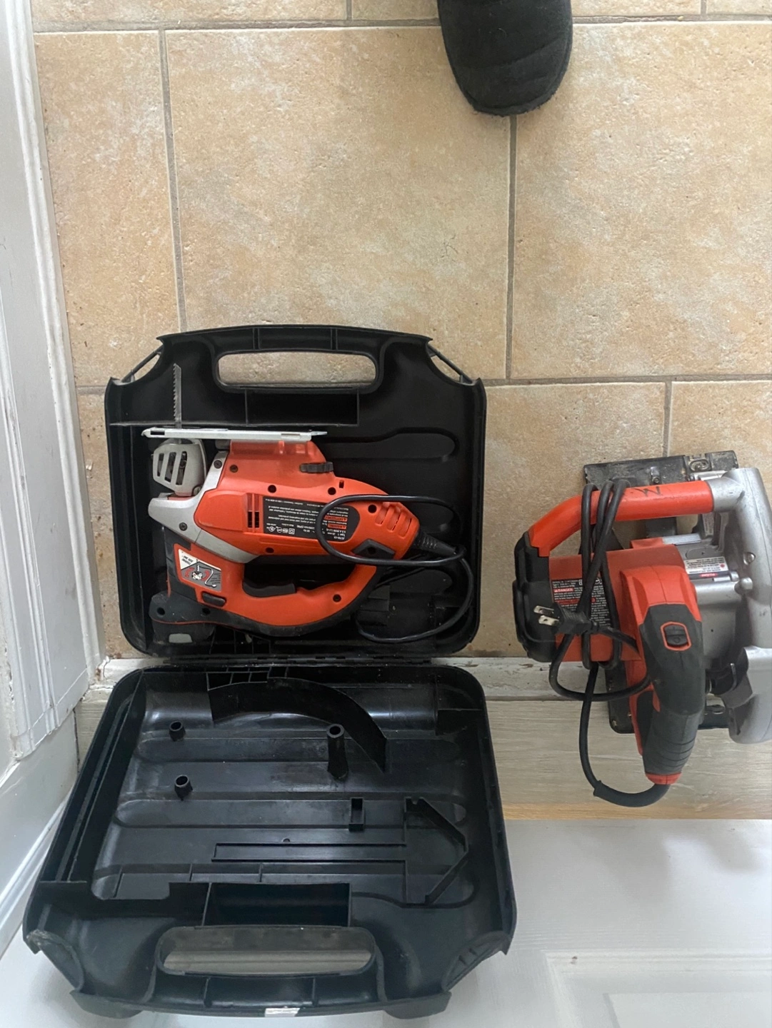 Bundle includes two power tools: a jigsaw and a circular saw. Also includes two Igloo coolers, one with wheels. A single-serve coffee maker and a Little Green Bissell carpet cleaner complete the bundle. All items are used.