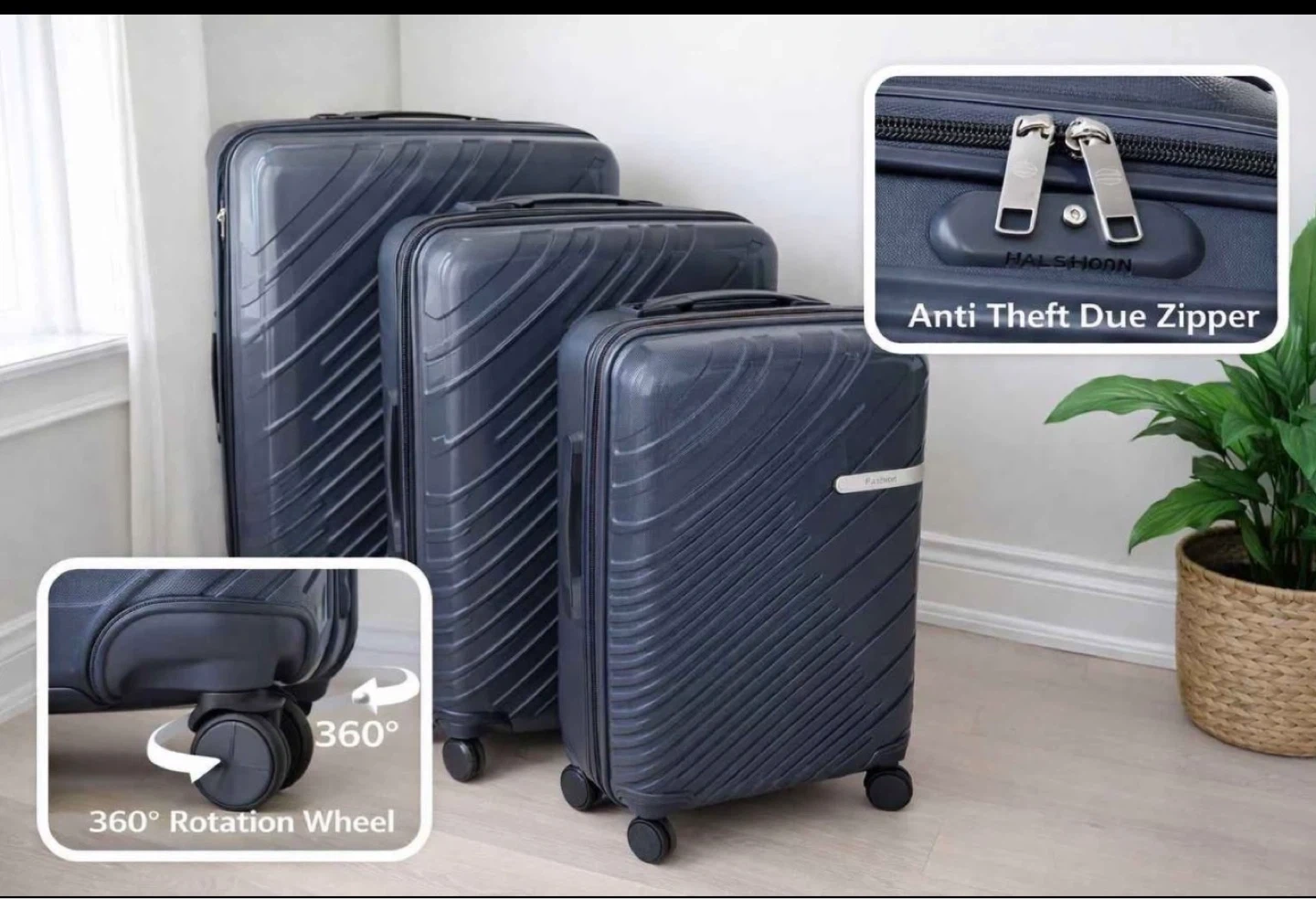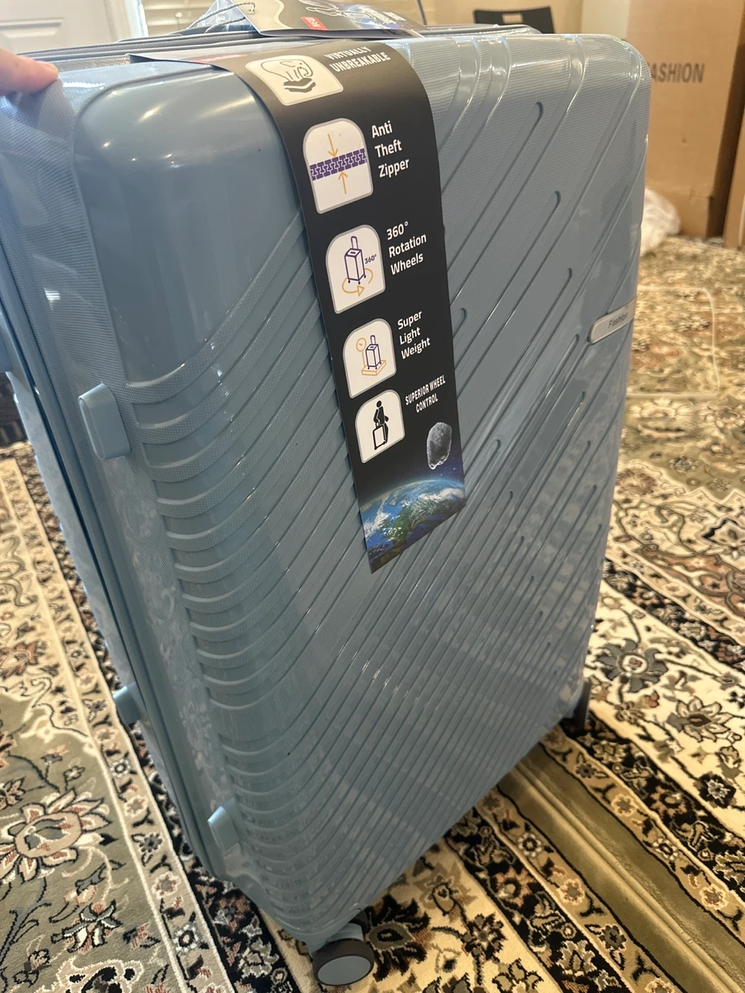 This set brand new unbreakable two light blue suitcases. Features include anti-theft zippers, 360° rotation wheels, and super light weight design. Superior wheel control for easy handling.