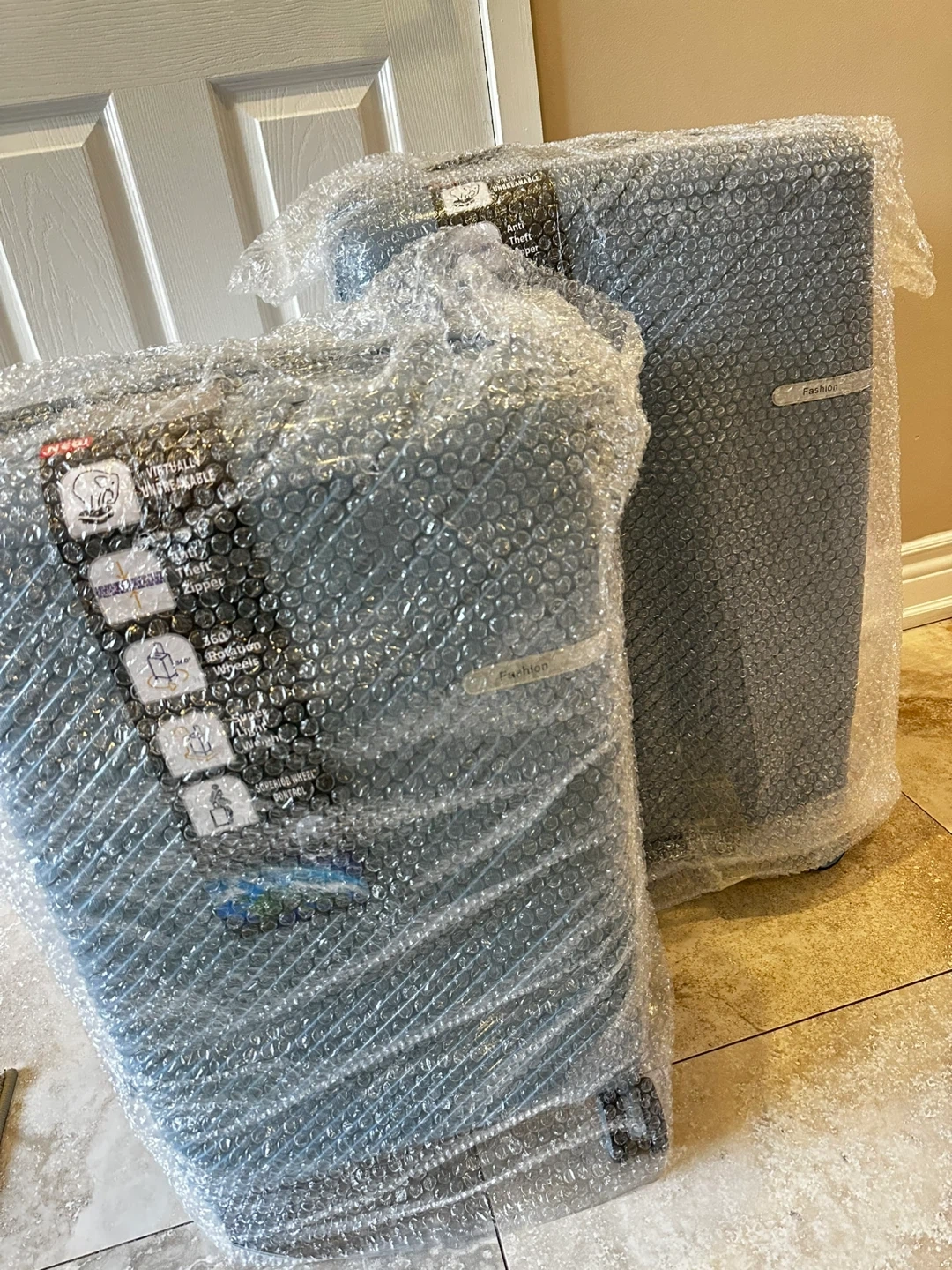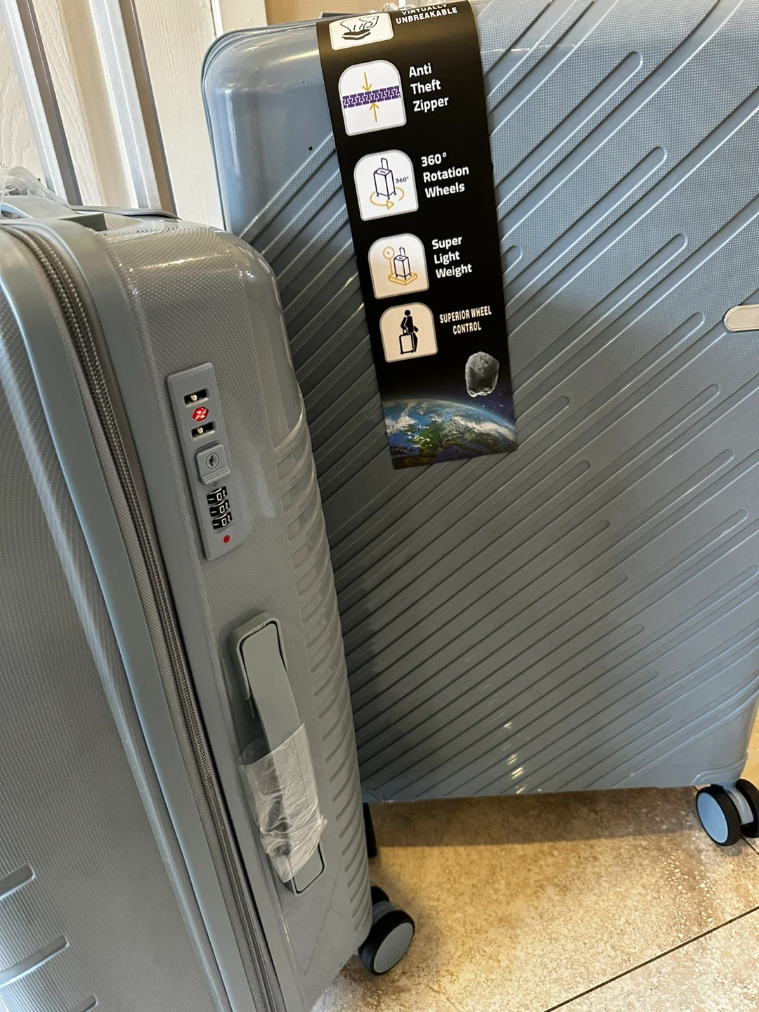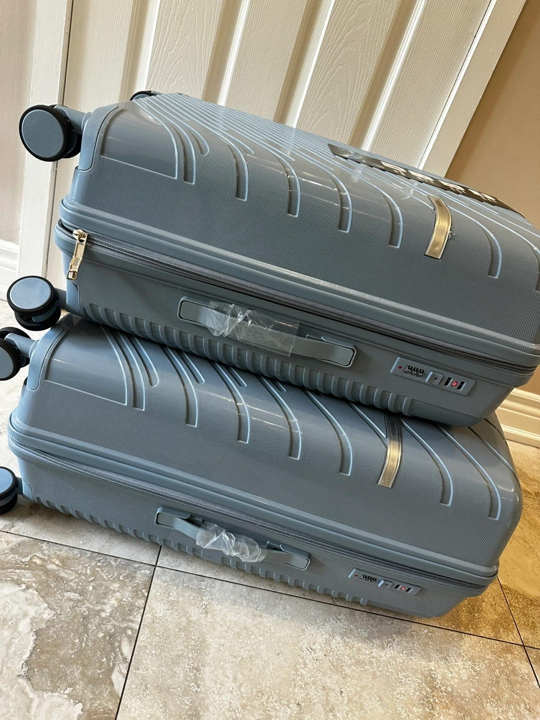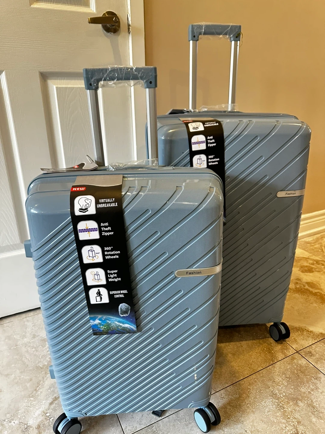 This set brand new unbreakable two light blue suitcases. Features include anti-theft zippers, 360° rotation wheels, and super light weight design. Superior wheel control for easy handling.
