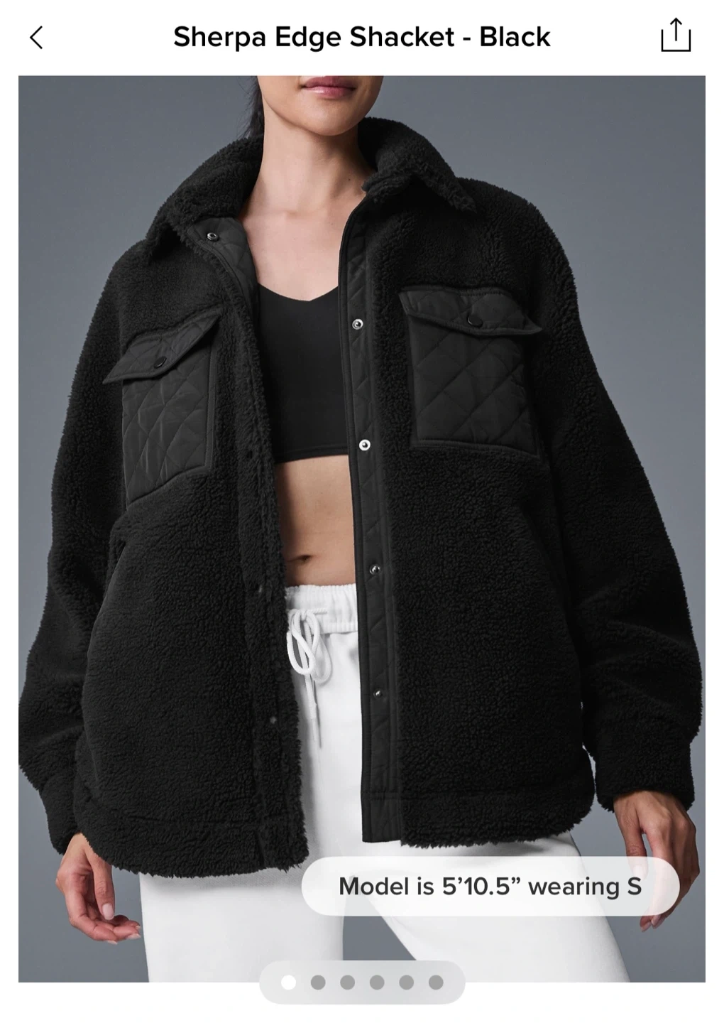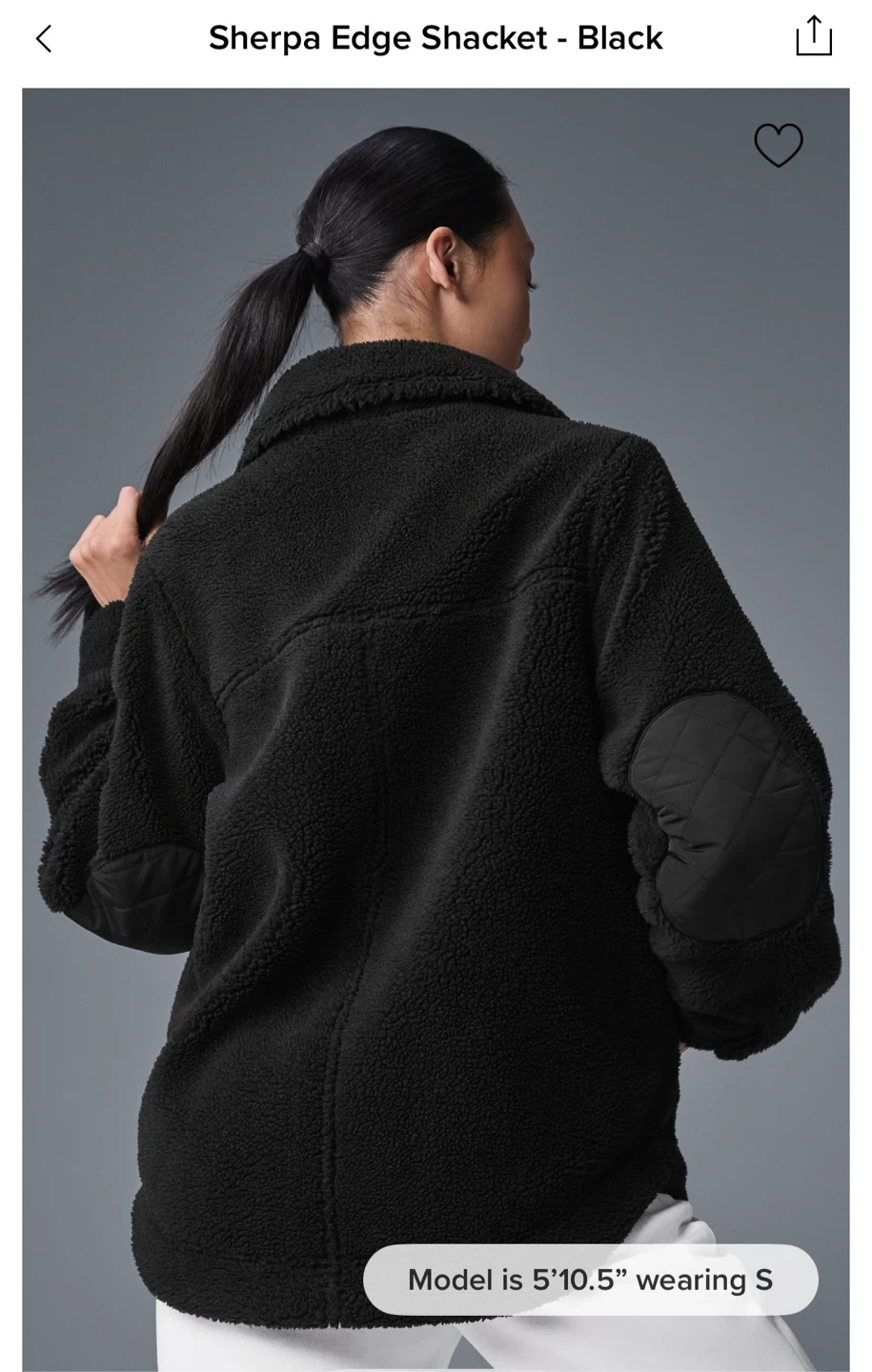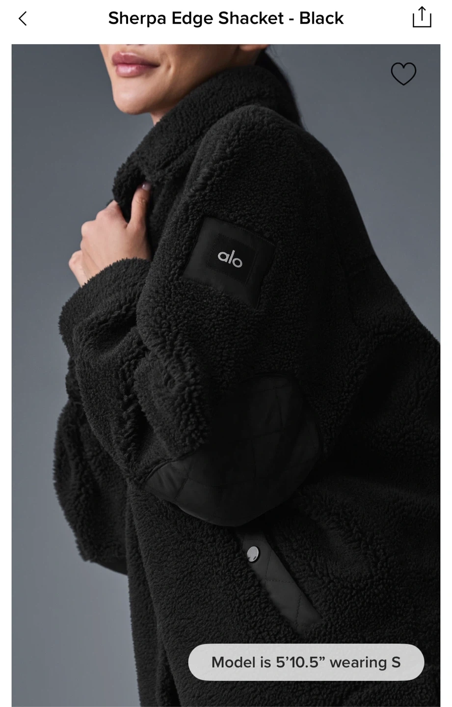 Cozy up in this stylish black sherpa jacket from ALO Yoga! It's perfect for layering on chilly days. Features include quilted detailing on the pockets and elbows. Great for adding a touch of warmth and style to your wardrobe