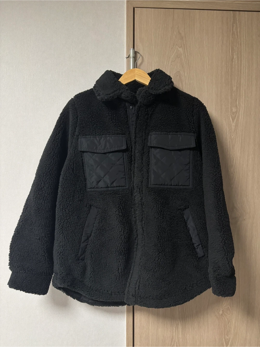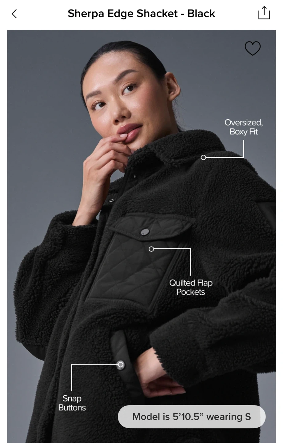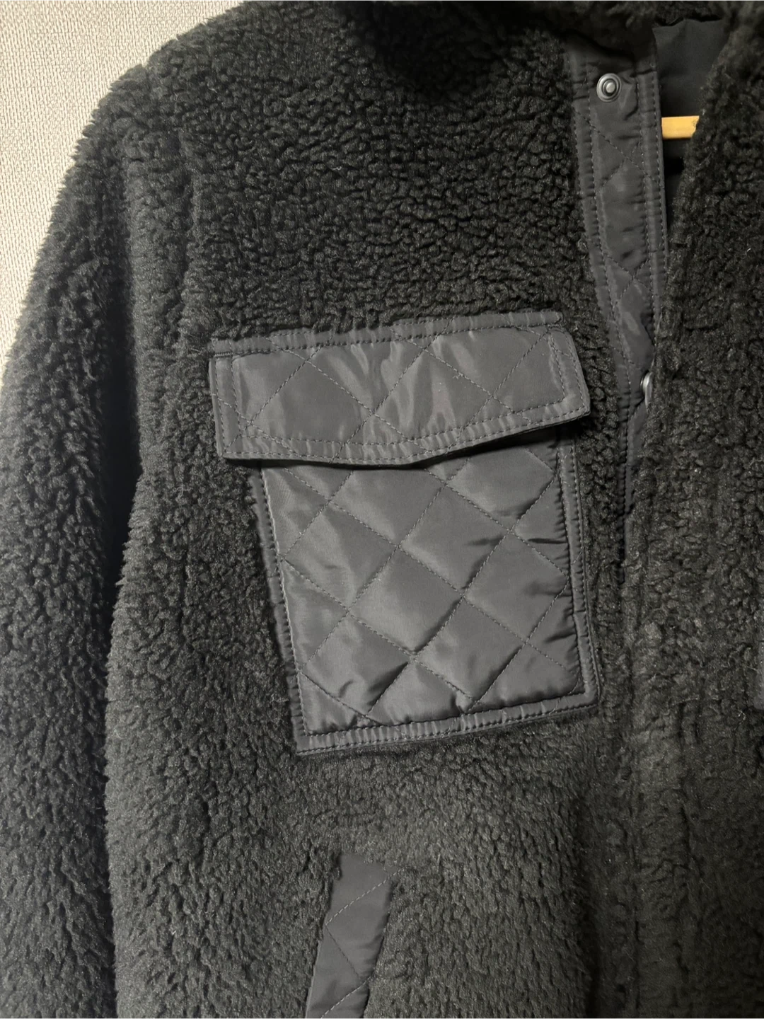 Cozy up in this stylish black sherpa jacket from ALO Yoga! It's perfect for layering on chilly days. Features include quilted detailing on the pockets and elbows. Great for adding a touch of warmth and style to your wardrobe