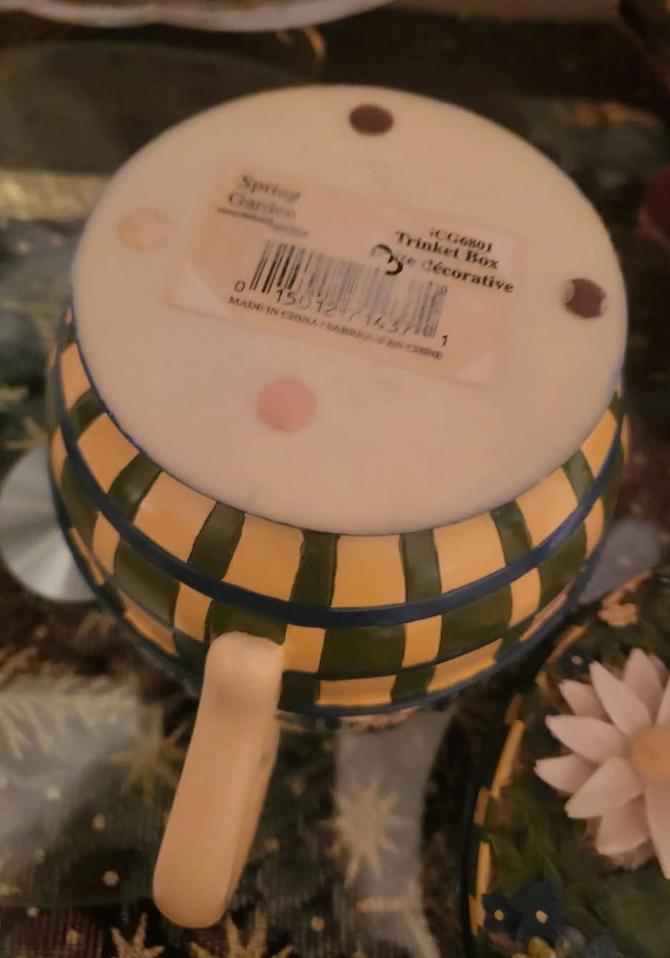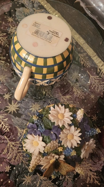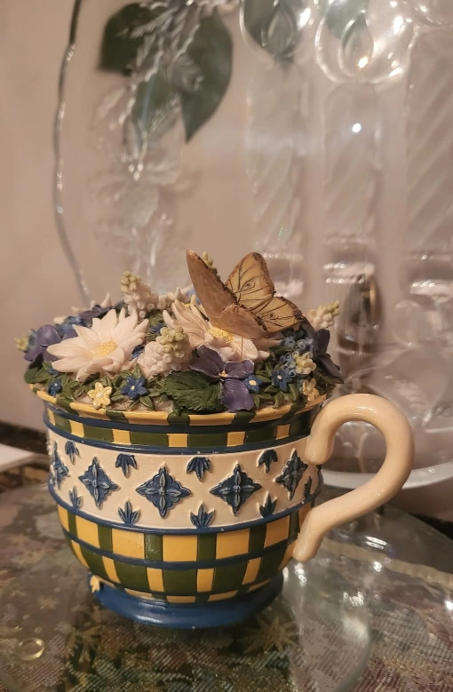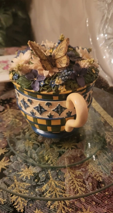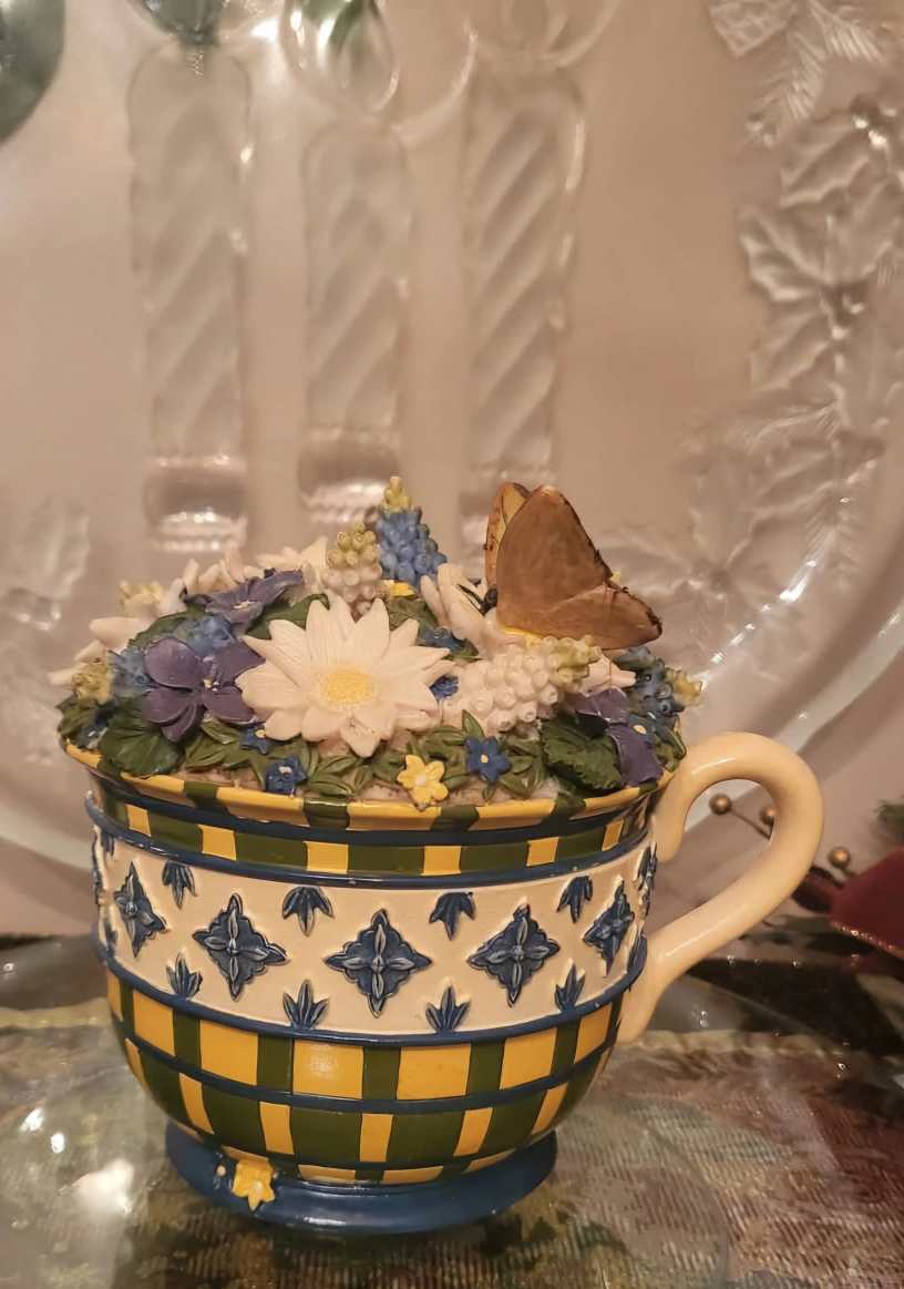 Adorable trinket box shaped like a teacup. Features a floral design with daisies, violets and other wildflowers. A butterfly sits atop the lid. Yellow, blue and green colour scheme.