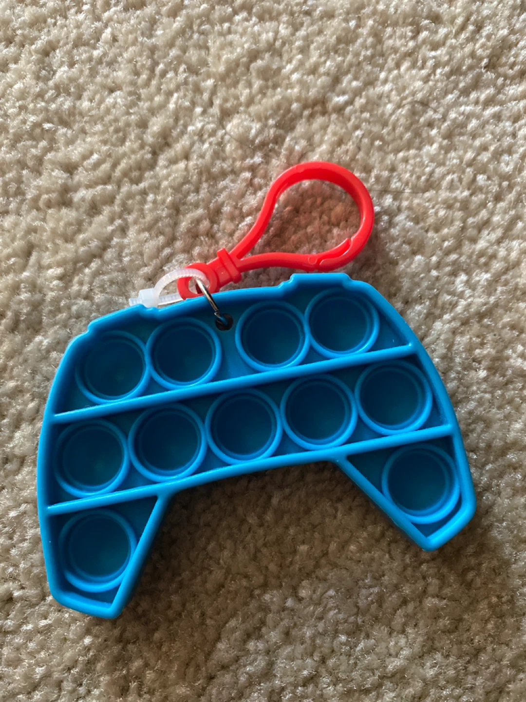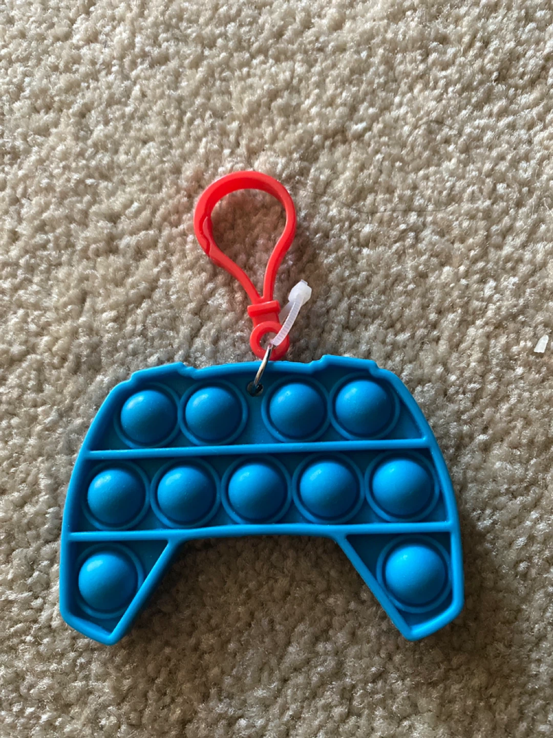 A cute blue game controller shaped Pop It! It comes with a red keychain attachment so you can clip it onto your backpack or keys. Perfect for keeping your hands busy!
