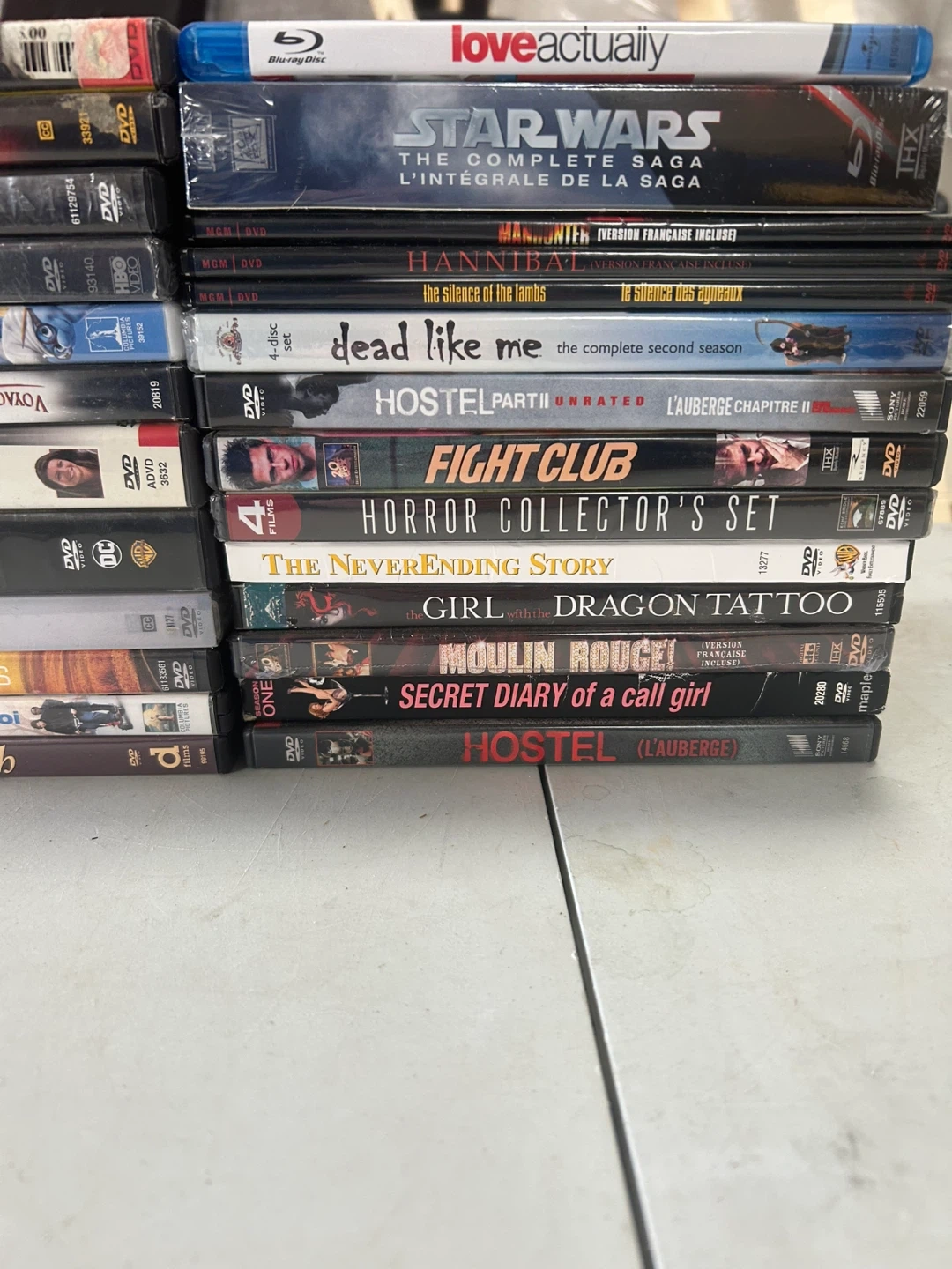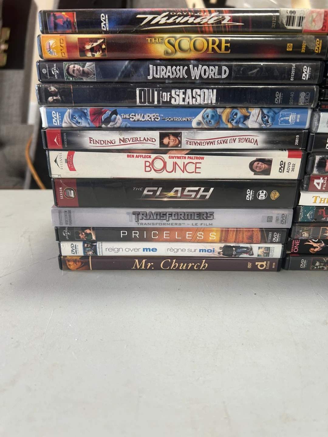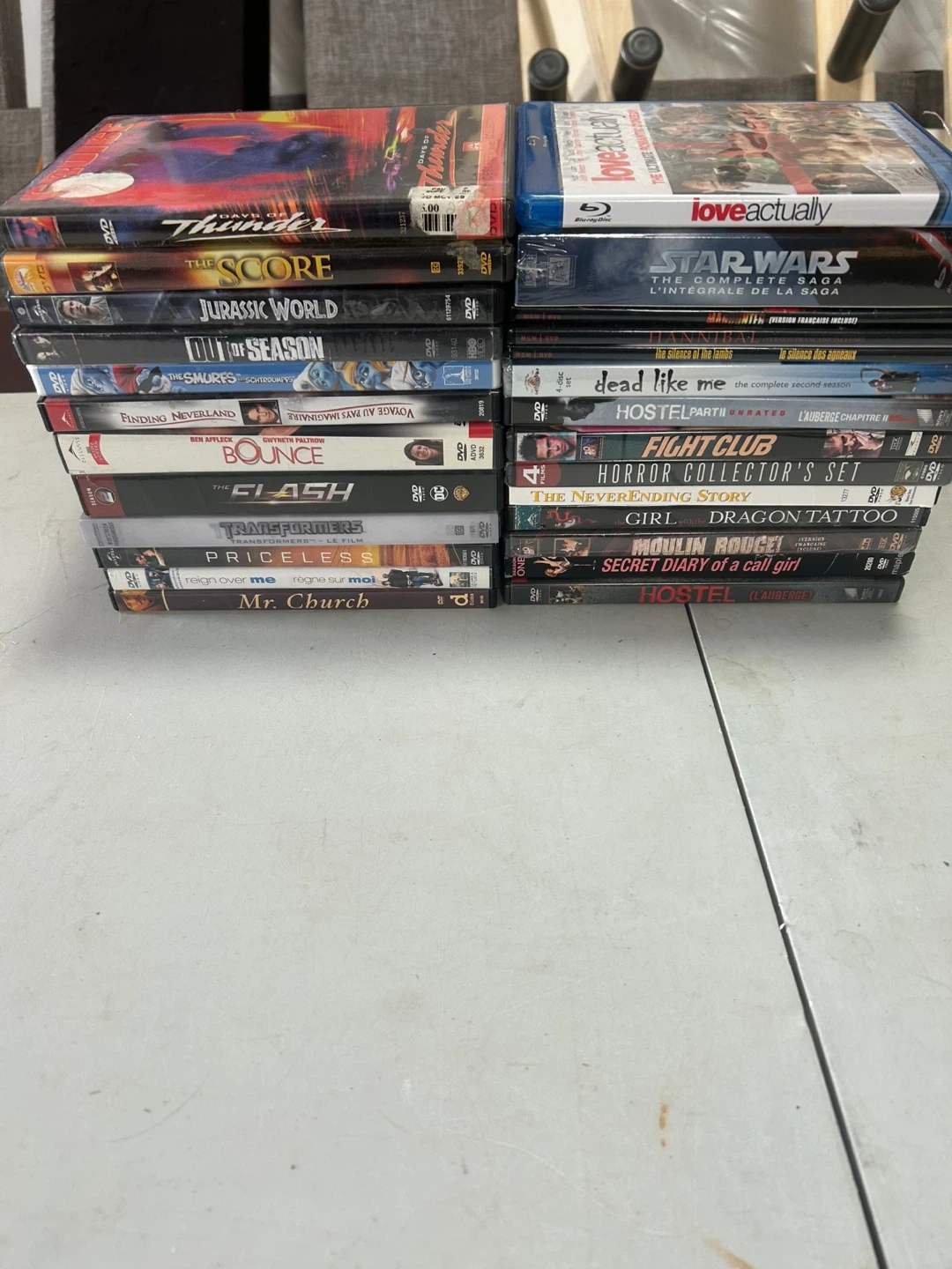 A collection of various DVDs and a single Blu-ray disc. Titles include 'Thunder', 'The Score', 'Jurassic World', 'Out of Season', 'The Smurfs', 'Finding Neverland', 'Bounce', 'The Flash', 'Transformers', 'Priceless', 'Reign Over Me', 'Mr. Church', 'Love Actually', 'Star Wars: The Complete Saga', 'Hannibal', 'Dead Like Me', 'Hostel Part II', 'Fight Club', 'Horror Collector's Set', 'The NeverEnding Story', 'Girl with the Dragon Tattoo', 'Moulin Rouge!', and 'Secret Diary of a Call Girl'. Price for all