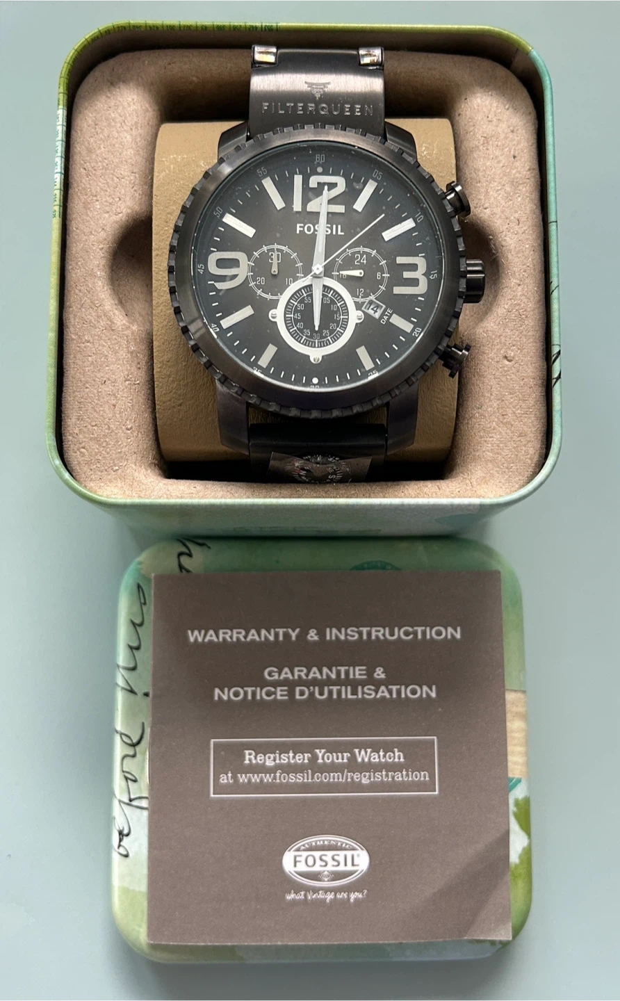 This is a men's Fossil chronograph watch with a black metal band. It features a black dial with white hour markers and a date display. Comes in its original tin packaging.