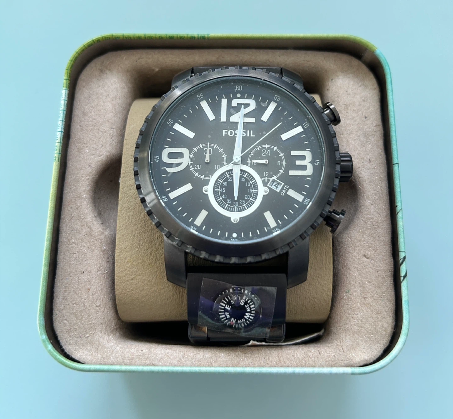 This is a men's Fossil chronograph watch with a black metal band. It features a black dial with white hour markers and a date display. Comes in its original tin packaging.